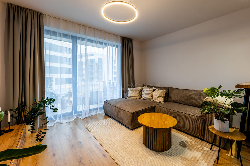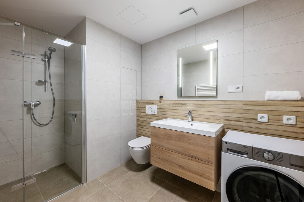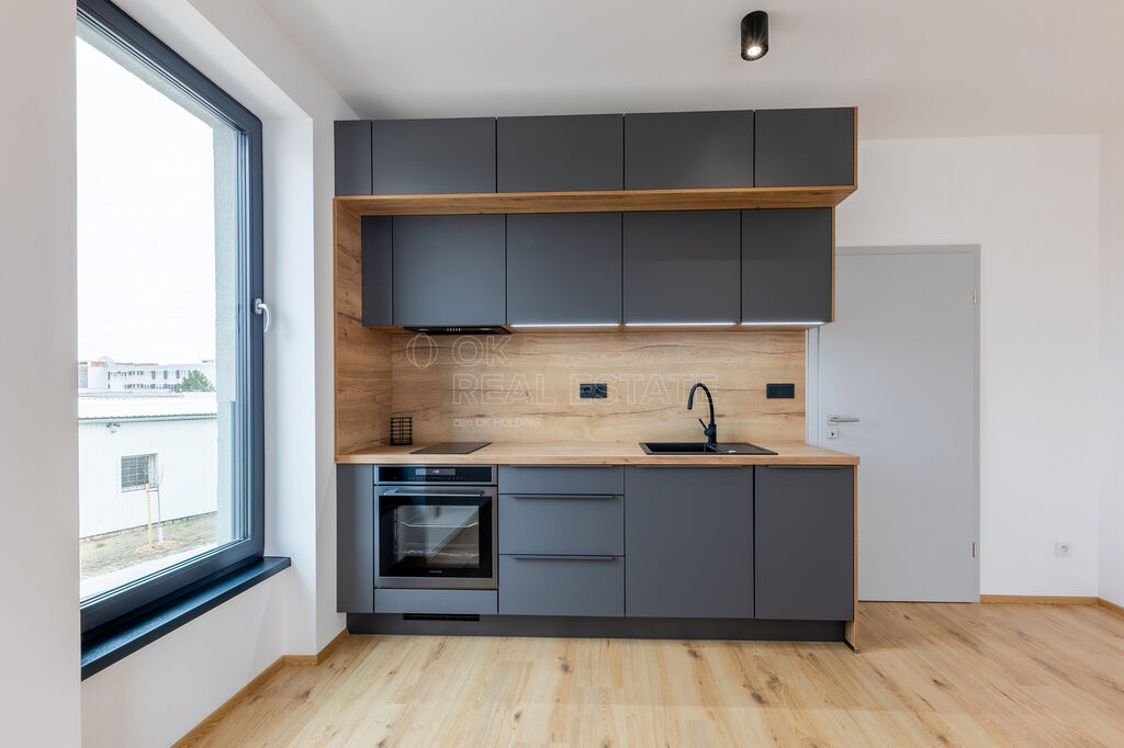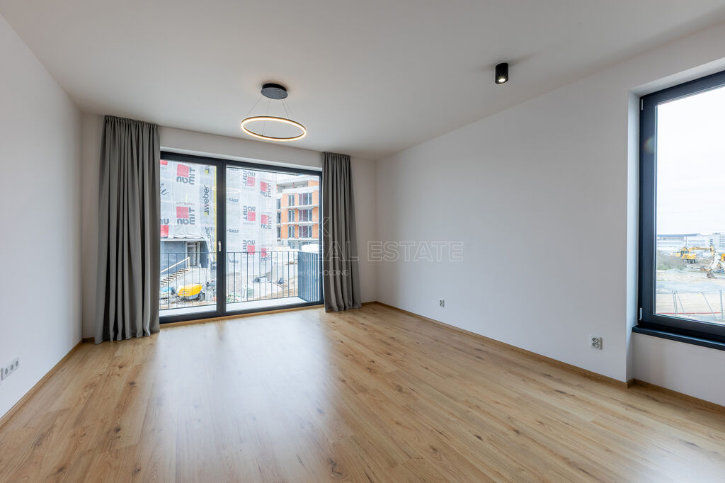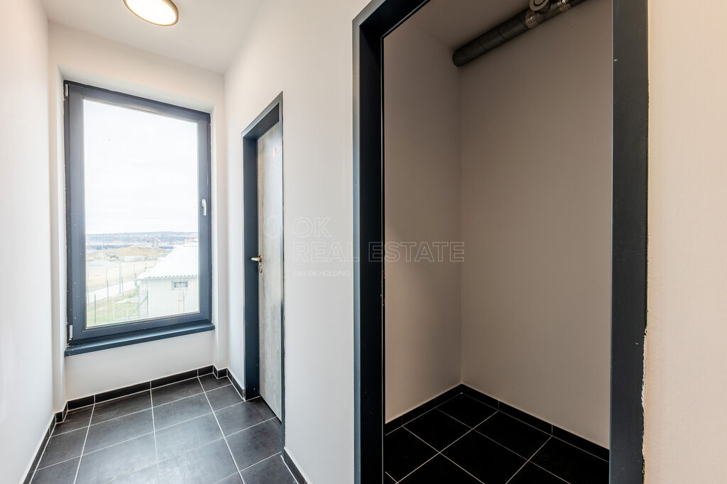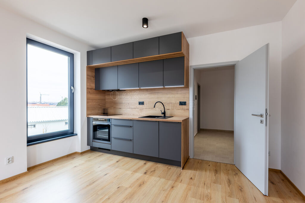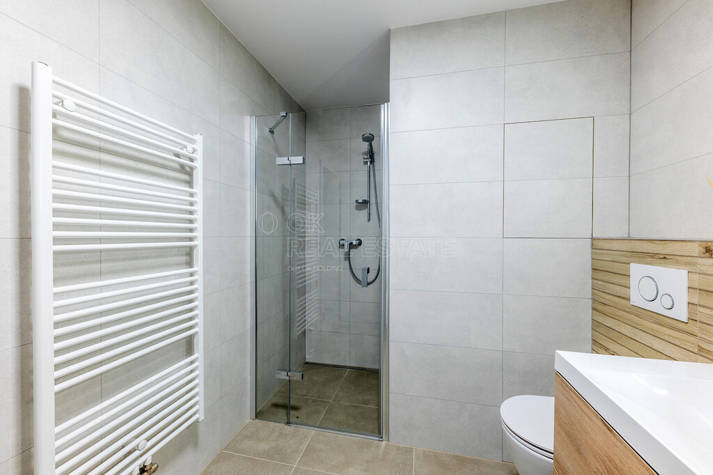 V bytě se nachází obývací pokoj (23 m2) s moderně zařízenou kuchyňskou linkou s veškerými spotřebiči včetně lednice a robotického vysavače, kvalitně provedená koupelna včetně velkoformátové dlažby s WC, sprchovým koutem a pračkou se sušičkou (5,4 m2) a předsíň (cca 6 m2), ve které je na míru vestavěná prostorná skříň. K bytu dále náleží balkón o ploše zhruba 4 m2 s výhledem do klidného okolí, sklepní kóje hned vedle bytu a venkovní parkovací stání za příplatek 1.000 Kč. Velkou výhodou bytu je podlahové vytápění a smart systém na regulaci teploty skrze mobilní aplikaci.