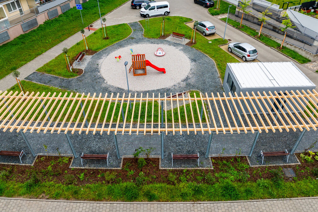 Veškerá občanská vybavenost je v dostupné vzdálenosti, včetně školy, školky, autobusové zastávky, zastávky MHD, obchodu, obchodního centra, dětského hřiště hned u domu, restaurace, pošty, polikliniky a lékárny.