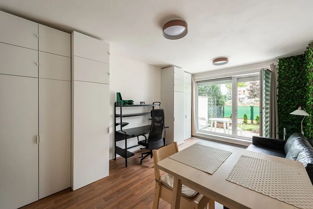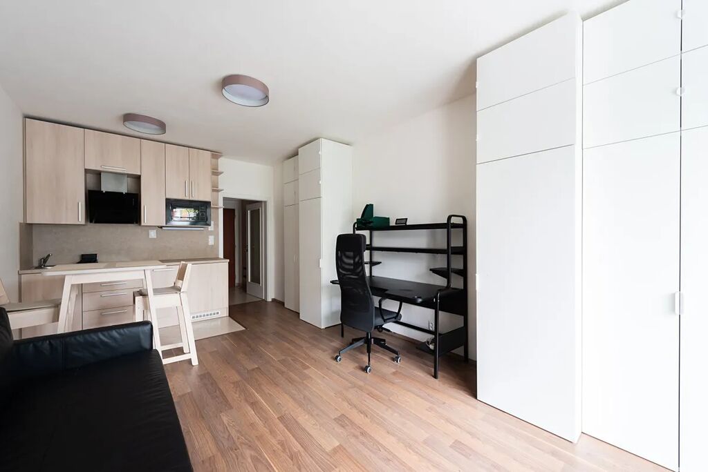 Byt má světlou obytnou místnost s kuchyňským koutem, rozkládací pohovkou (určenou ke každodennímu spaní), jídelním stolem se dvěma židlemi a samostatným pracovním stolem. Součástí vybavení je i množství úložných prostor včetně několika šatních skříní a botníku.