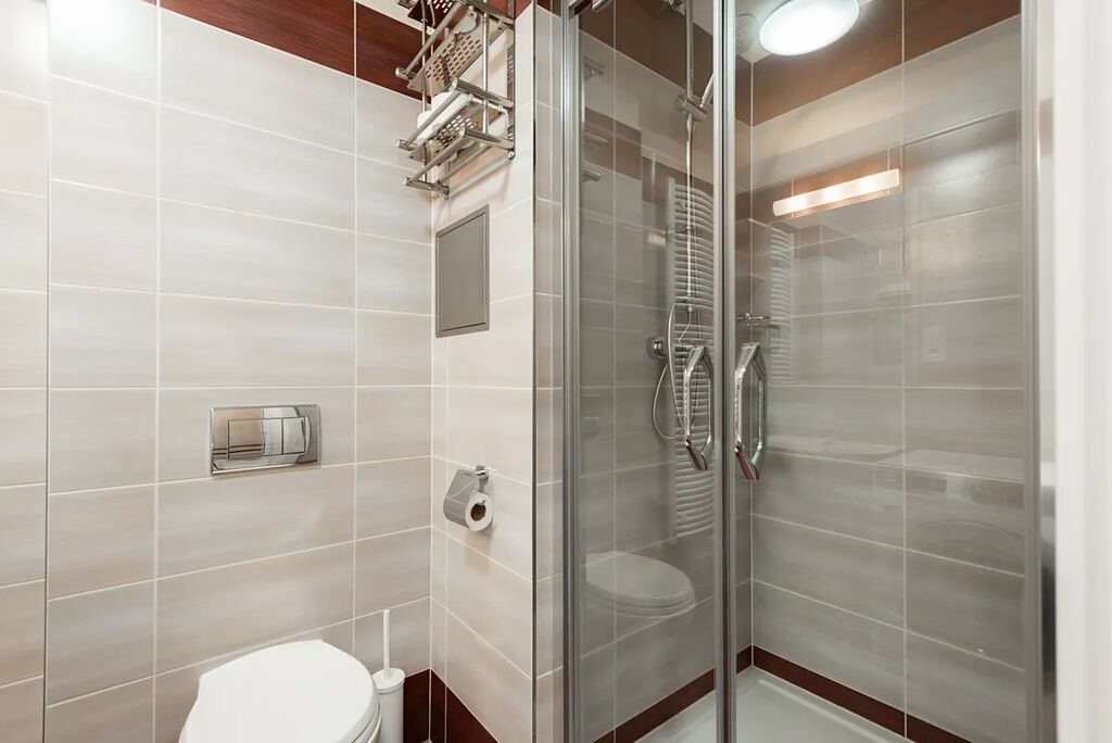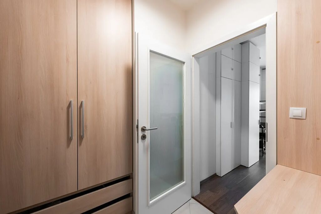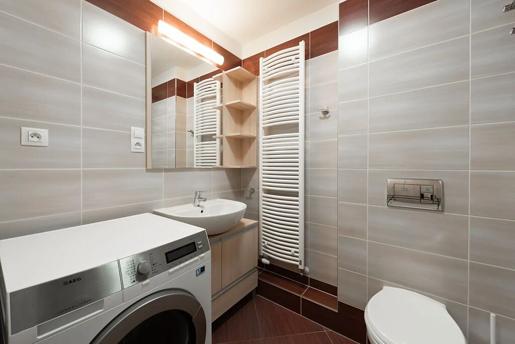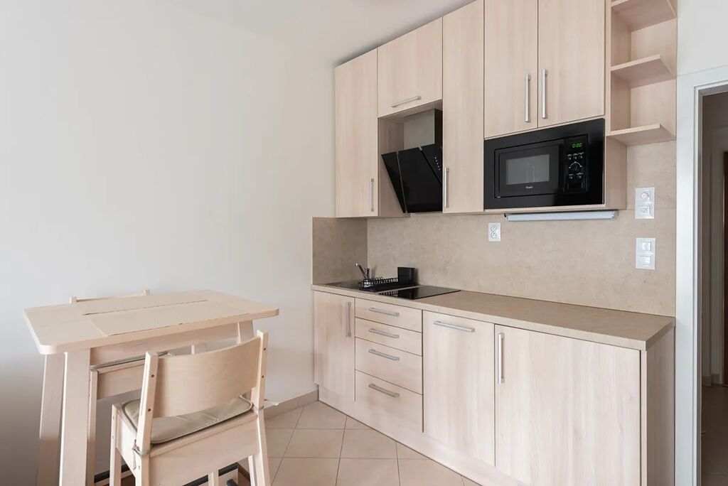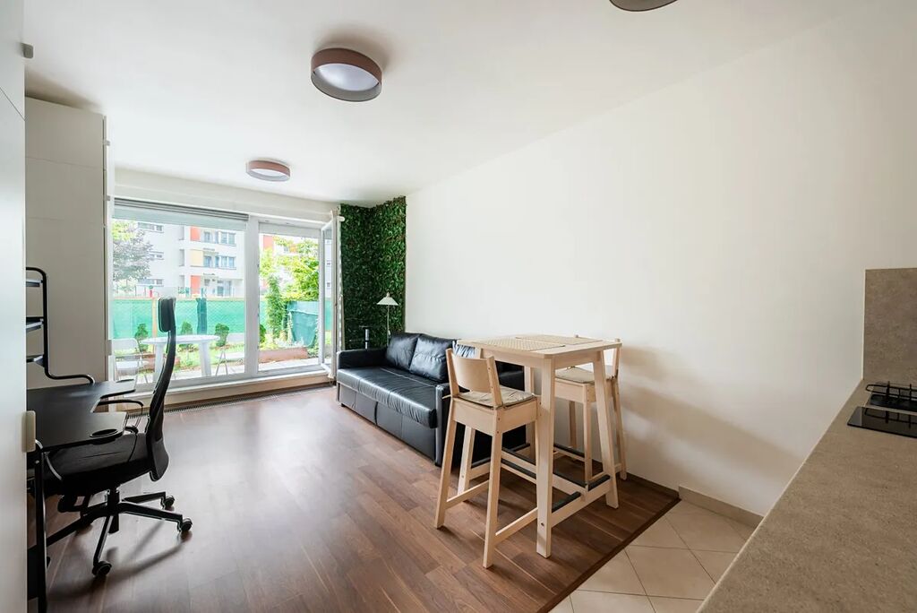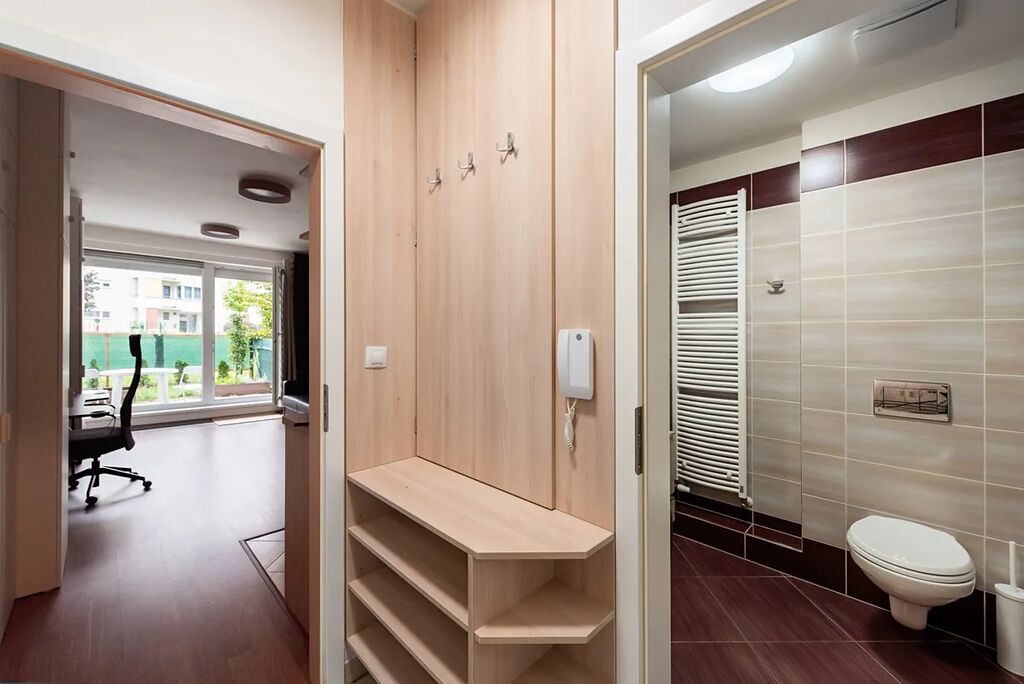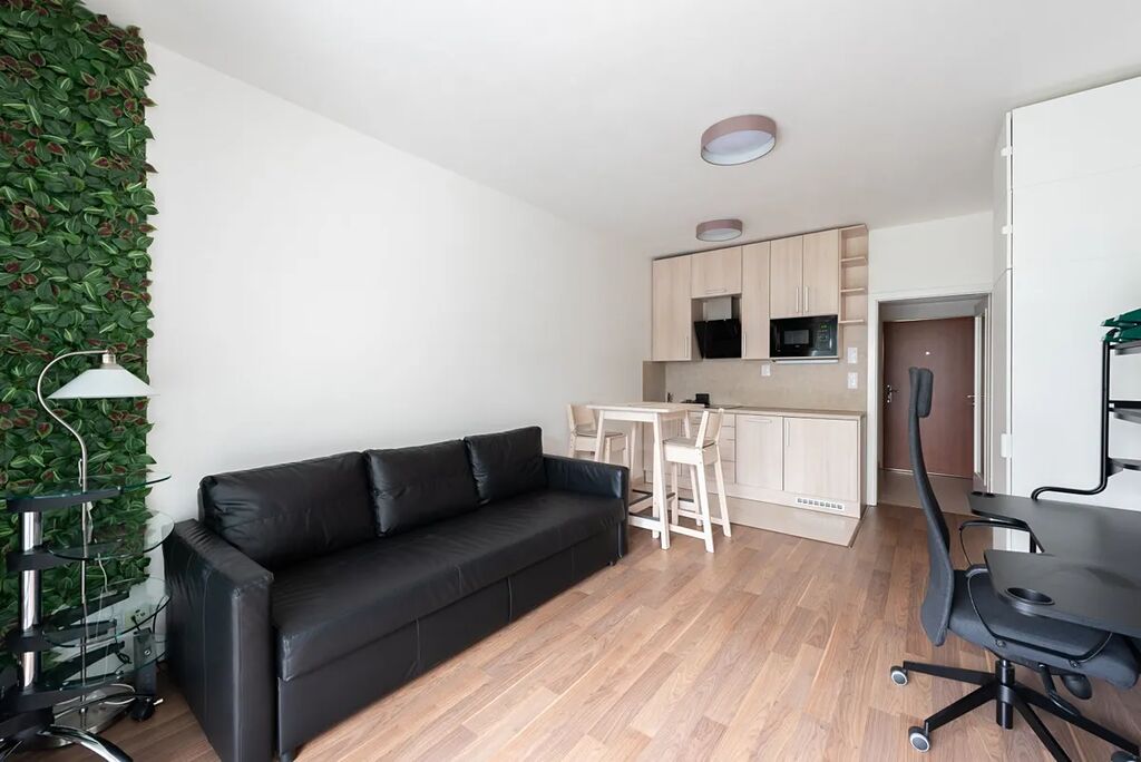 Moderní kuchyňská linka nabízí vše potřebné pro každodenní provoz – varnou desku, mikrovlnnou troubu, digestoř, myčku i lednici. Nechybí ani dostatek pracovní plochy a úložného prostoru. Prostorná koupelna je vybavena sprchovým koutem, nájemníkovi je k dispozici je také kombinovaná pračka se sušičkou a toaleta je součástí.