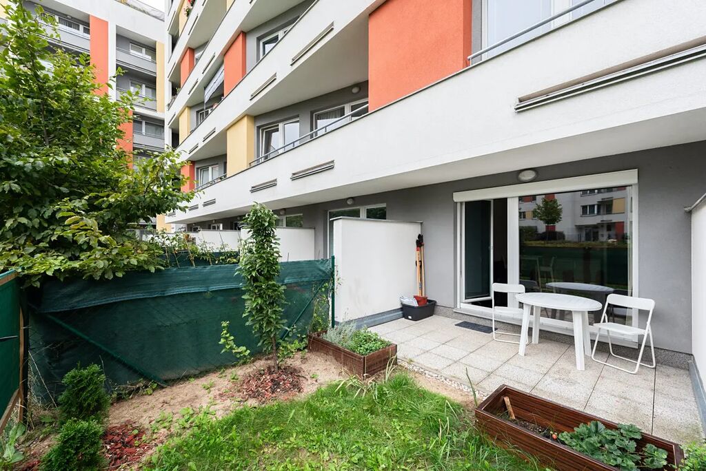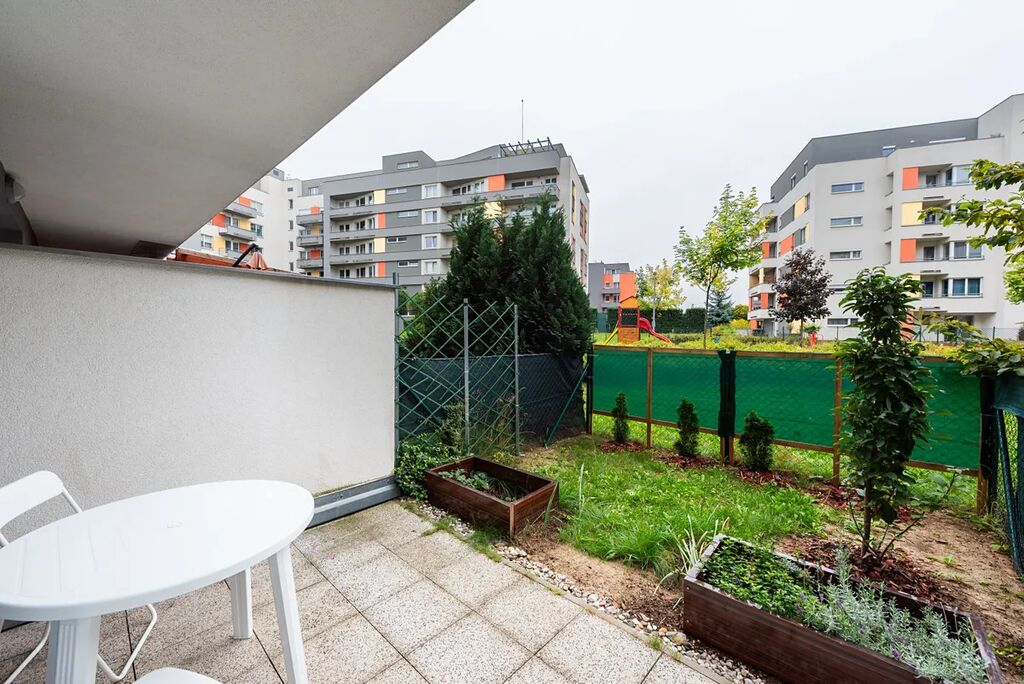 Přímo z bytu vyjdete na venkovní prostor, který je rozdělen na terasu (je krytá balkonem a má 7 m2) a předzahrádku (12 m2). Díky orientaci do vnitrobloku poskytuje klidné místo pro venkovní posezení nebo odpočinek, díky západní orientaci dostatek slunce a jistě zde zvládnete vypěstovat spoustu bylinek a uspořádat menší grilování.
