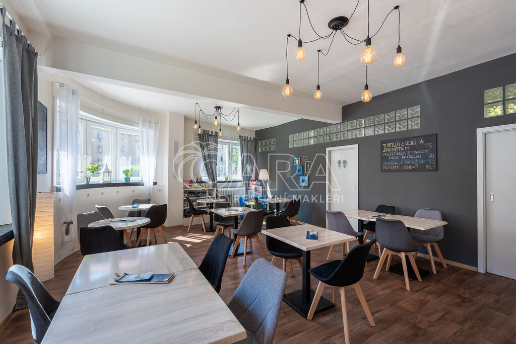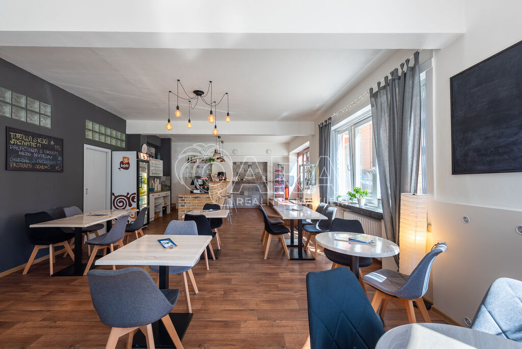Dispozice: vchod z ulice, prostor kavárny s barovým pultem, kuchyňka a 2 toalety