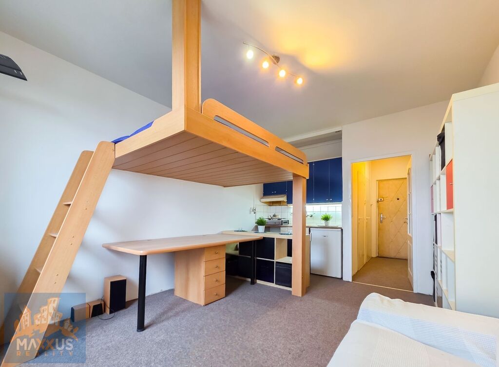 Dispozice bytu: vstupní chodba s vestavěnou skříní, koupelna se sprchovým koutem a umyvadlem, samostatná toaleta a obývací pokoj s kuchyňským koutem. Pokoj je vybaven patrem na spaní, pohovkou a pracovním stolem. Kuchyňská linka disponuje pultovou lednicí, plynovým vařičem a přípojkou na pračku. Majitel bytu je otevřený komunikaci ohledně případných změn ze strany zájemců.