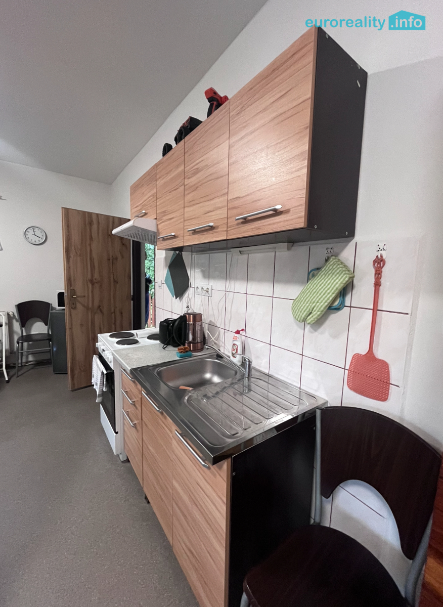 Byt se skládá z chodby, samostatné toalety, obytné místnosti a koupelny se sprchovým koutem. Obytná část bytu je rozdělena příčkou na dvě části. V první části se nachází kuchyňský kout s jídelním stolem a pohovkou. Druhá část je vybavena jako ložnice s manželským lůžkem.
