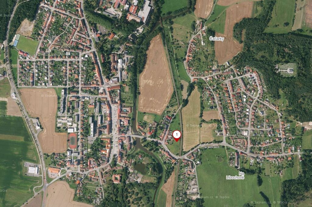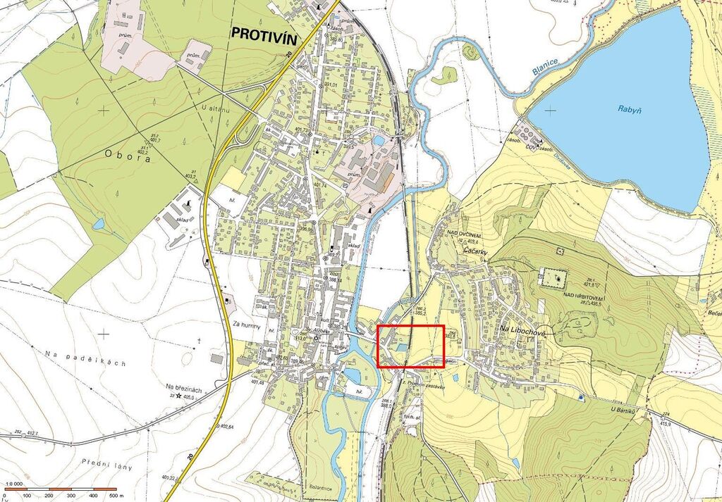 Pozemek leží na okraji obce Protivín blízko železniční trati.
