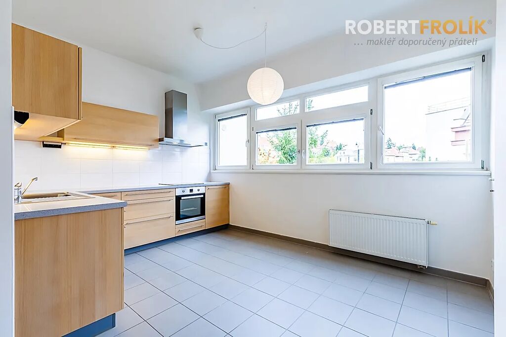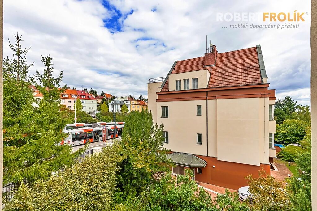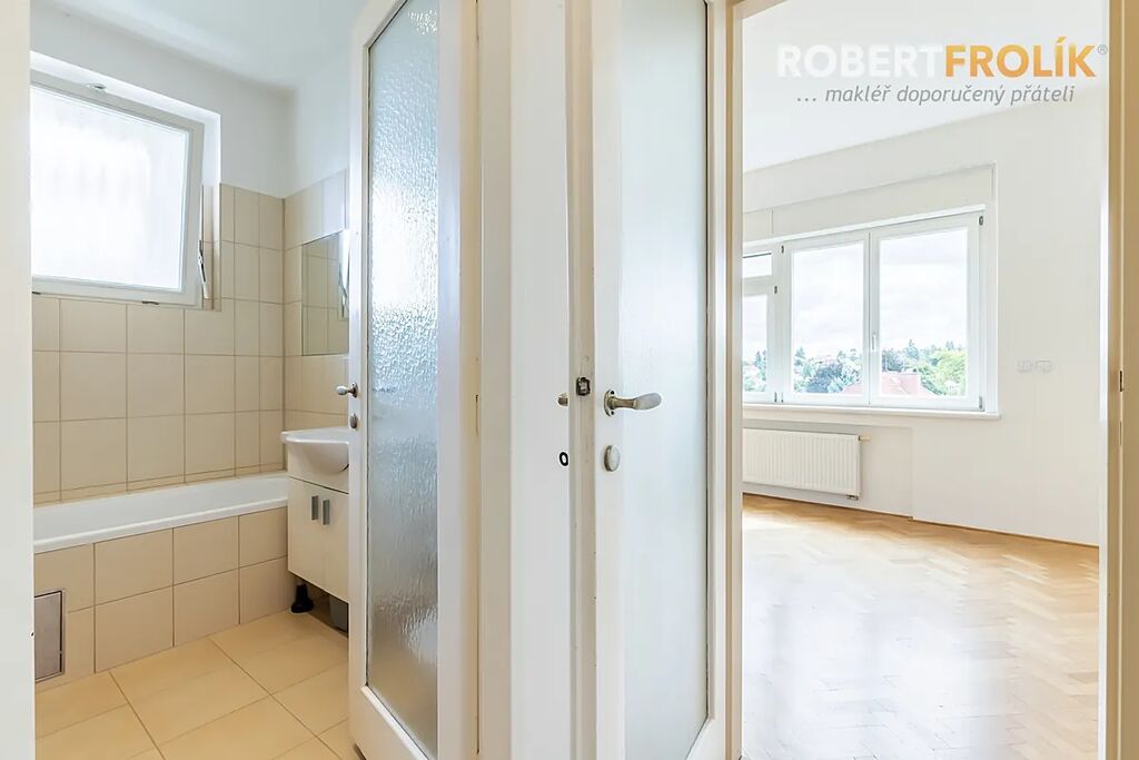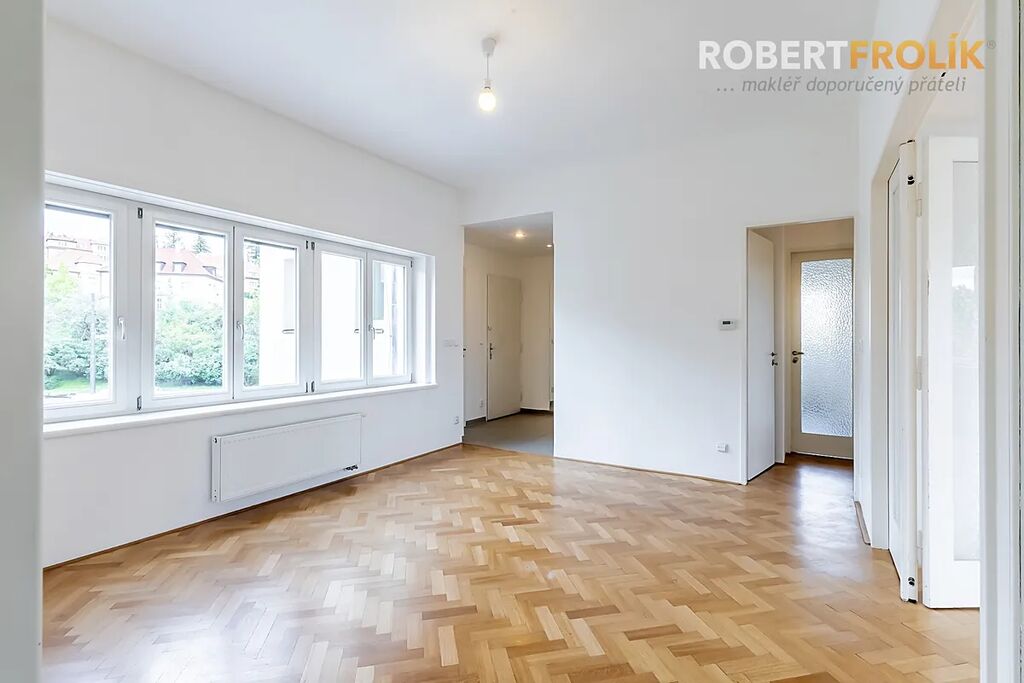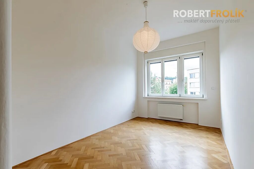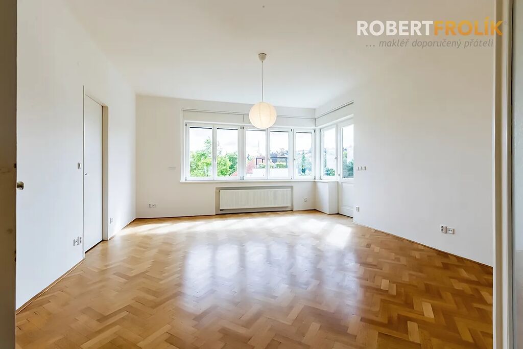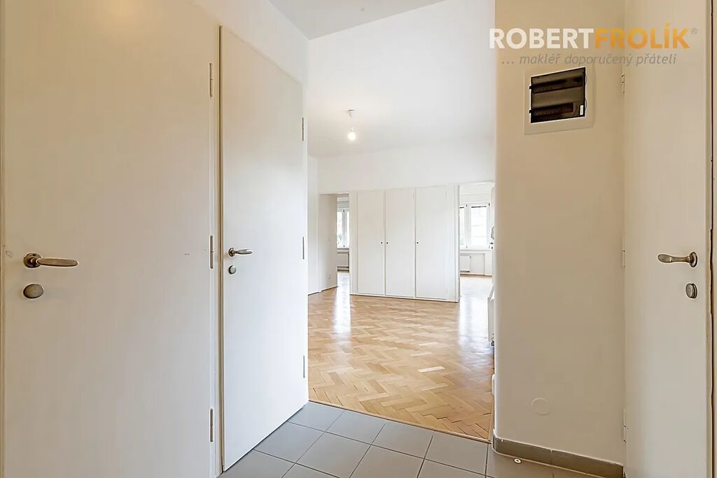 Byt je to opravdu velkorysý! Má dostatečně veliké místnosti, poctivé dřevěné parkety, velká Euro okna s dvojskly a předokenními elektrickými roletami, pěkné výhledy a orientaci na všechny světové strany. Kromě toho spoustu různých úložných vestavěných skříní a zrekonstruované původní prvky. V srdci bytu Vás jistě okouzlí nádherný prostor, který může vzniknout propojením haly (s otevírací prosklenou stěnou) a obývacího pokoje.