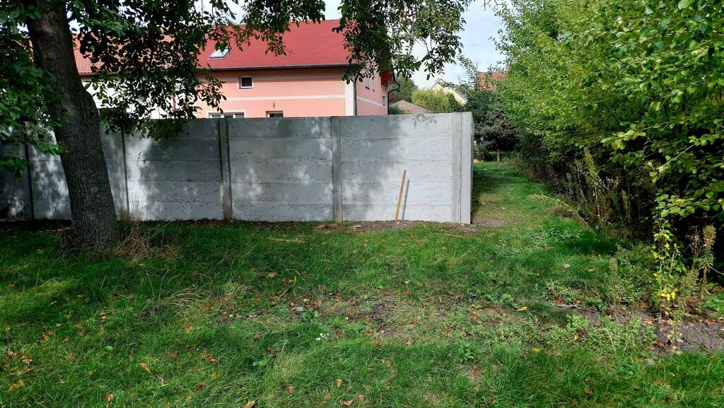 Nové betonové oplocení se sousedním domem, vjezd na pozemek po vlastní příjezdové cestě široké 3,5metru.