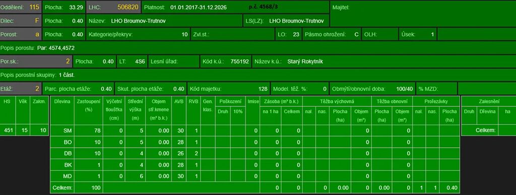 - p.č. 4568/3 vedená jako lesní pozemek o celkové výměře 19 575 m2, stáří lesa je 23 let (zastoupení dřevin: smrk, borovice, dub, buk, modřín)- v LHO nesouhlasí plocha lesa