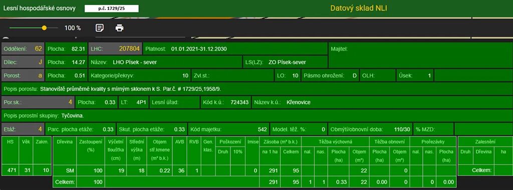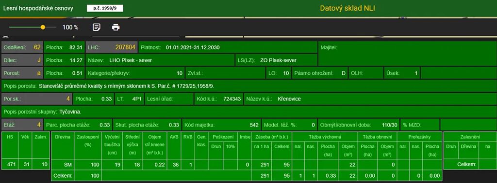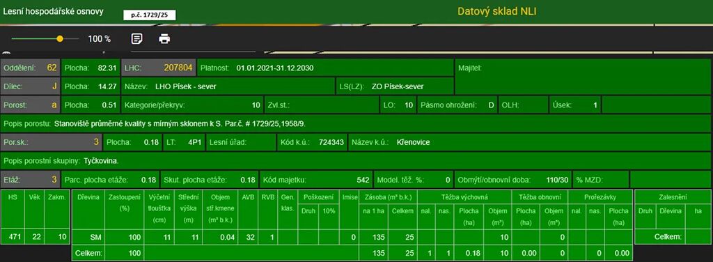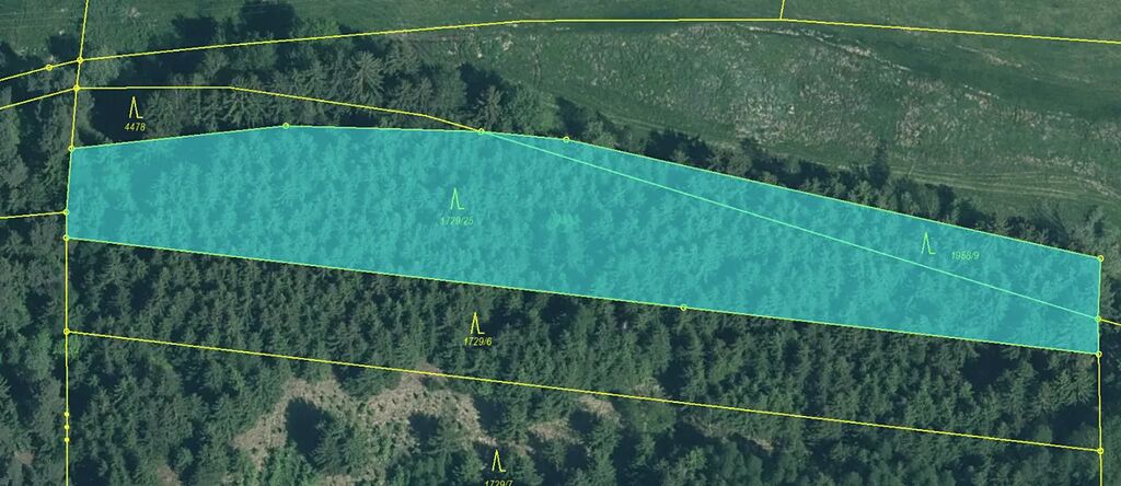 Jedná se o p.č. 1729/25 vedená jako lesní pozemek o celkové výměře 4 251 m2 a p.č. 1958/9 vedená jako lesní pozemek o celkové výměře 5 088 m2.