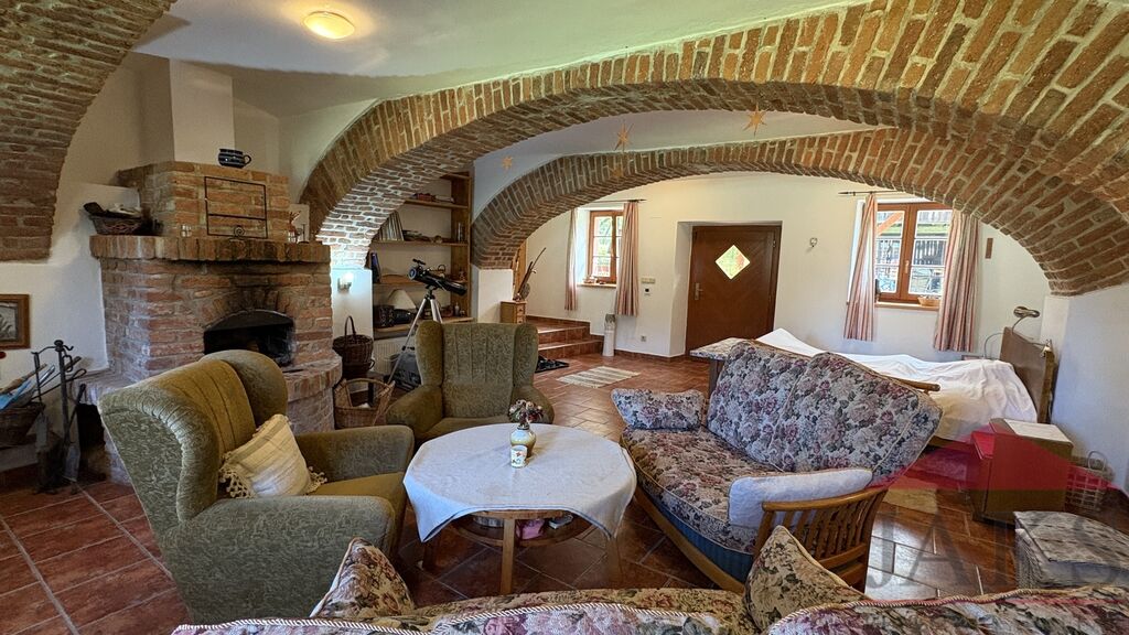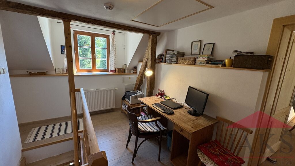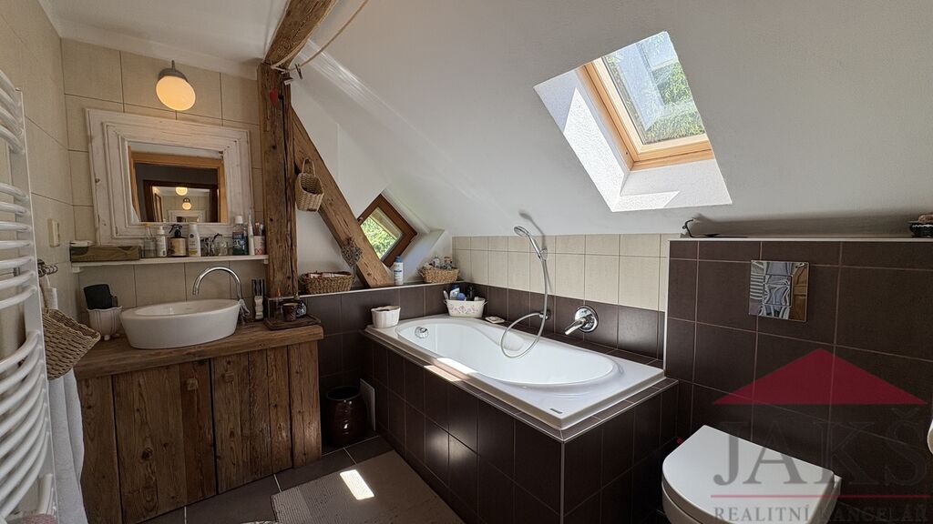 Popis: část. podsklep.; sklepy (elektrokotel a el. boiler) s klenbou; přízemí 169 m2: garáž, zastřešená veranda, chodba se schodištěm, koupelna (umyv., sprch. kout walk in, WC, pračka), kuchyň 34 m2 (kuch. linka s HV troubou, sklo-ker. deskou, myčkou, digestoří) se spíží a obytnou jídelnou (krbová kamna a zrestaurovaný stylový nábytek), prostorný obývací pokoj 50 m2 (krb, vstup na terasu; původní klenby z ručně vyrobených cihel), podkroví 143 m2: chodba (pracovní kout), koupelna (umyv., vana, WC, topný žebřík), 2x ložnice (buková podlaha), otevřený prostorný obývací pokoj 70 m2 s mezonetovým ležením, 2x komora (příprava pro kuch. linku; elektrokotel), koupelnou (umyv., sprcha, WC, topný žebřík) a ložnicí.
