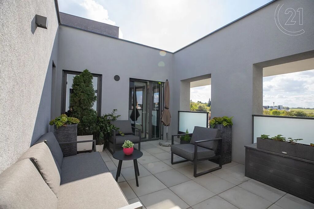 Srdcem bytu je velkorysý obývací pokoj, který vás okouzlí svou světlostí a propojením s moderní kuchyní i jídelním koutem. Díky přímému vstupu na terasu o velikosti 16 m² a lodžii o celkových 30 m², které obepínají velkou část bytu, získává interiér unikátní propojení s venkovním prostorem. Ať už si ráno vychutnáte kávu s výhledem nebo večer relaxujete s rodinou, vždy budete mít pocit, že příroda je součástí vašeho domova.