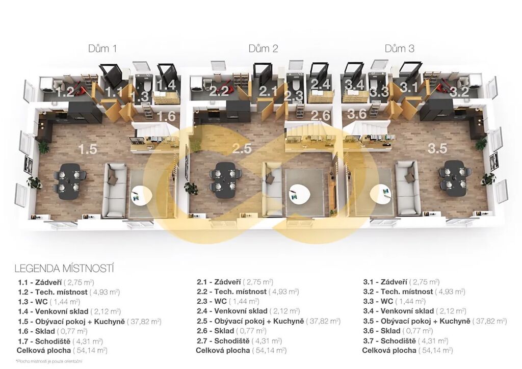 Tři samostatné byty s dispozicí 4+kk jsou součástí novostavby řadového trojdomku. Každý byt má vlastní vchod, zahrádku, parkovací stání před domem a sklad s přístupem zvenku.