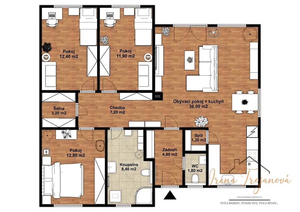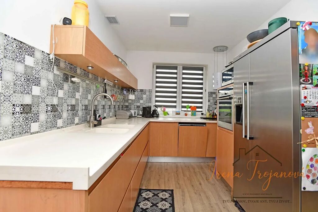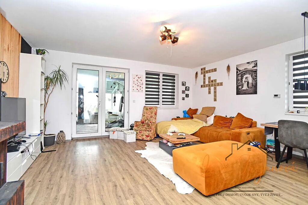 Dominantou domu je prostorný obývací pokoj s kuchyňským koutem vč. vestavěných spotřebičů (36m), který se stane centrem rodinného života. K dispozici jsou tři samostatné pokoje ložnice (12,8m) a dětské pokoje (12,4m2 a 11,9m2), šatna (3,2m2), praktická spíž (1,2m), koupelna s vanou a sprchovým koutem (8,4m2) a samostatné WC (1,8m2). Velkým bonusem je zimní zahrada (15m2), která propojuje interiér s exteriérem a poskytuje celoroční prostor pro relaxaci, a také terasa, kde si můžete vychutnat venkovní posezení s rodinou či přáteli.