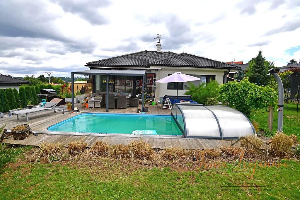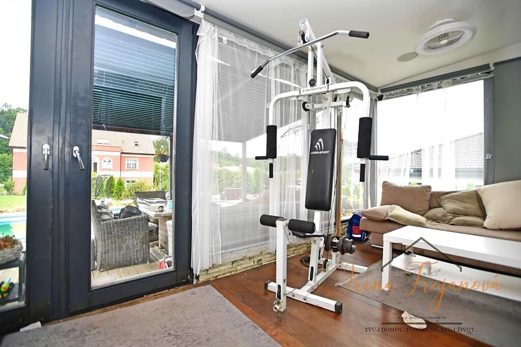 Na pozemku o výměře 1022m2 vás potěší krytý bazén o velikosti 6×3m, vířivka - jakuzzi a také zahradní domek, který poslouží jako praktické zázemí pro zahradní techniku nebo sportovní vybavení.