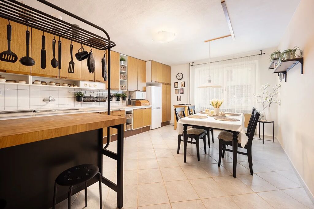 Dům je pečlivě udržovaný, v dobrém technickém stavu. Má dispozici 4+1 s podlahovou plochou kolem 300 m2 rozložených do tří pater a sklepního prostoru s garáží.
