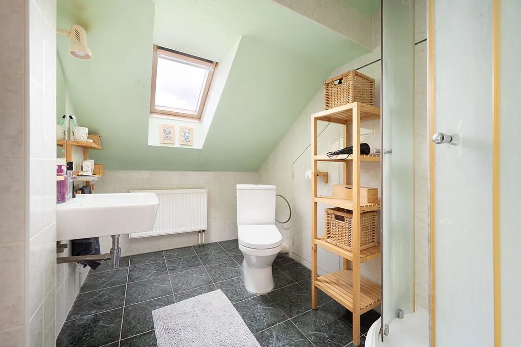 V podkroví domu je další pokoj s vlastní šatnou a koupelnou. V podstatě je to malá garsoniéra bez kuchyňského koutu.