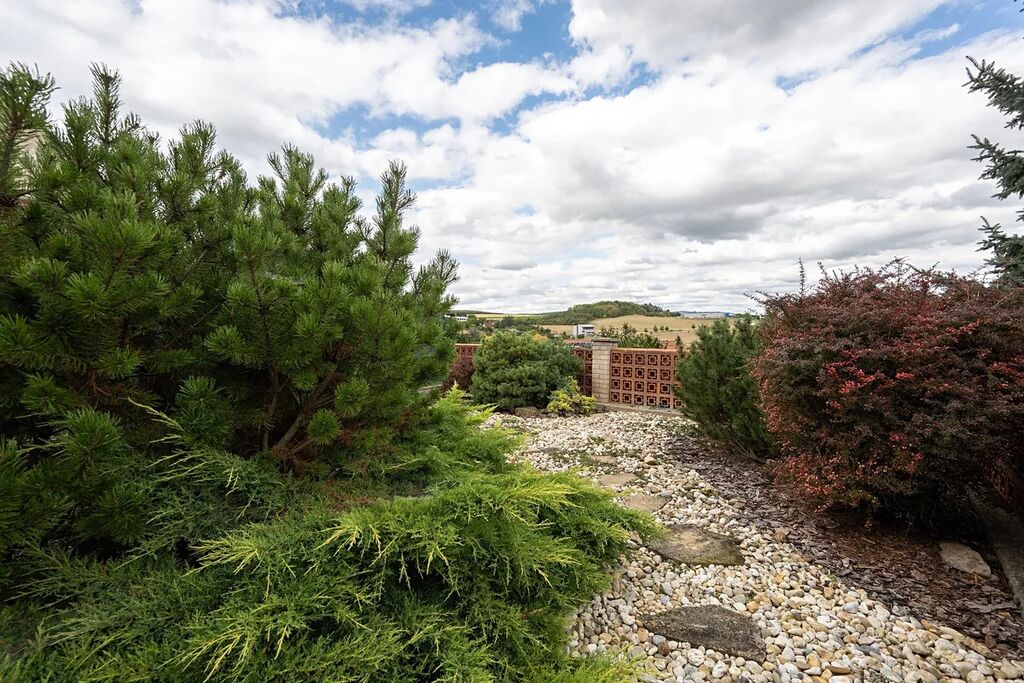 Zahrada za domem je v současné době koncipována jako místo odpočinku s krbem, je zde vzrostlá udržovaná vegetace.
