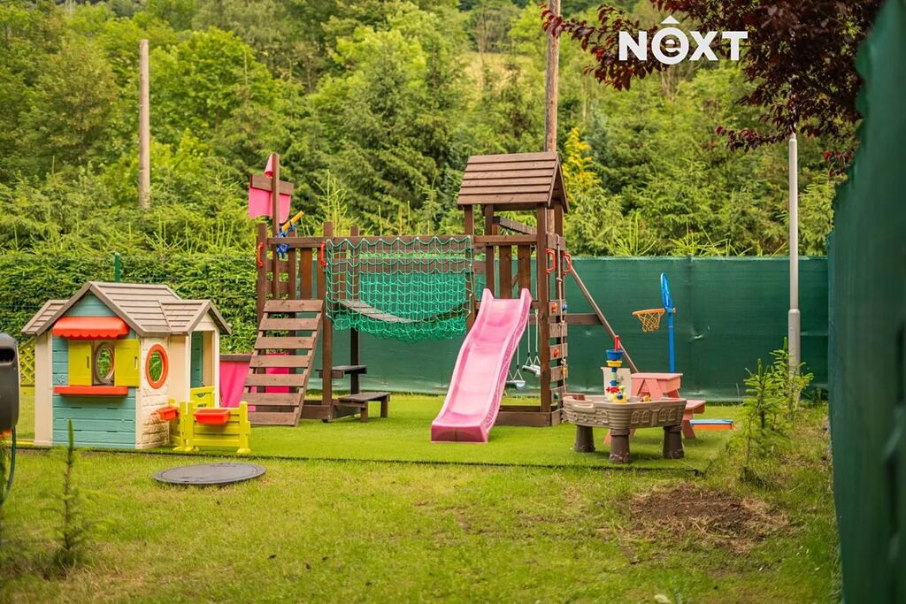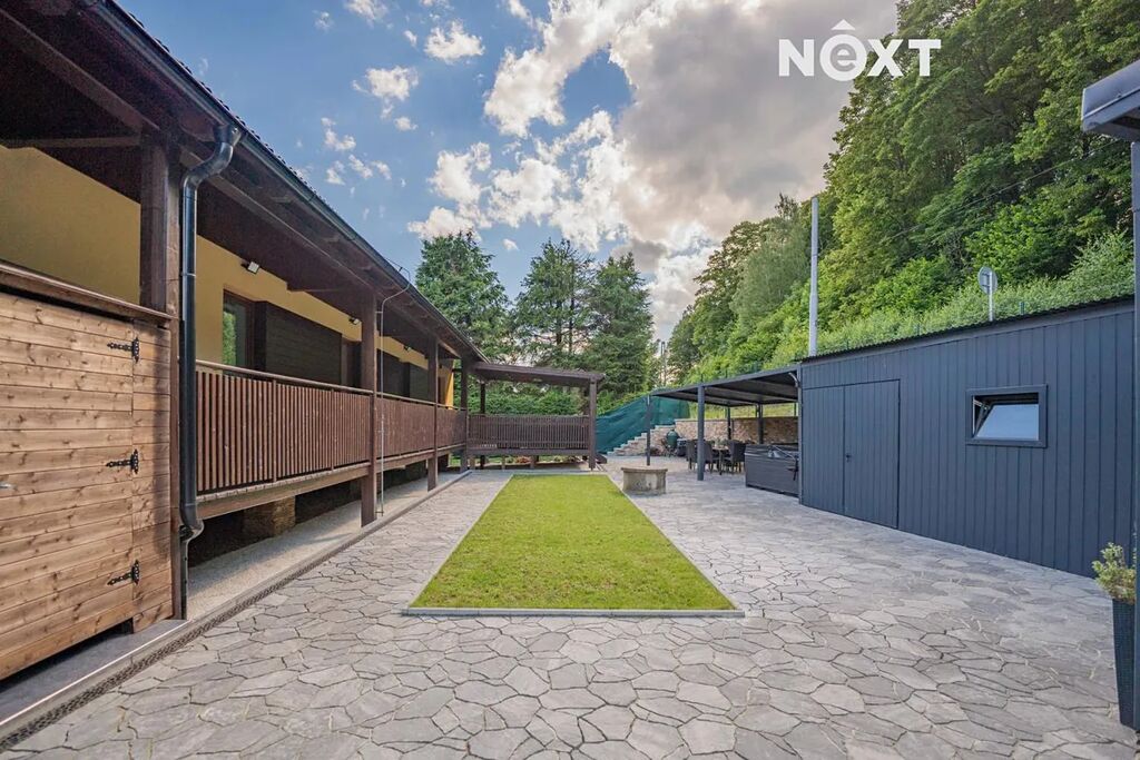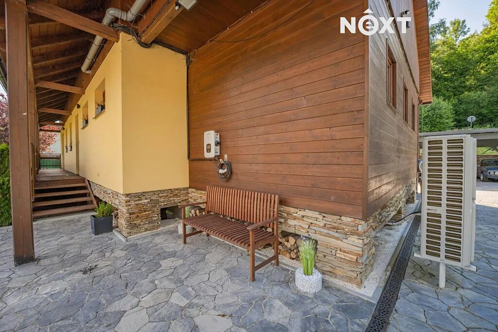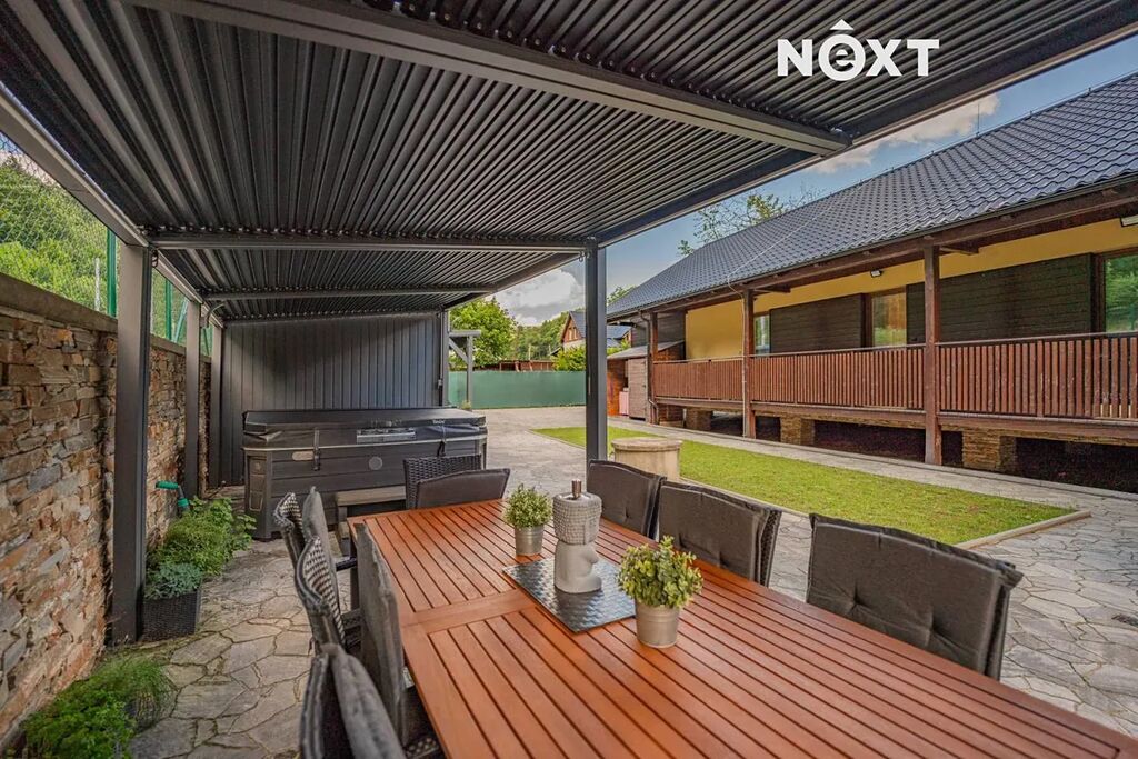 Dům je velice dobře propojen také s exteriérem, z většiny pokojů vedou francouzské dveře na venkovní dřevěný ochoz, z obýváku se dostanete k bazénu v zahradě. Pozemek je oplocen, opatřen elektrickou pojezdovou bránou, z přední strany je zatravněn a vybaven dětským hřištěm s vlastním osvětlením, v zadní části pak převažuje dlažba. Právě zde, v soukromí a na čerstvém horském vzduchu, se nachází letní kuchyň s venkovní toaletou, bioklimatická pergola, přístřešek na auta a zahradní domek s vlastním rozvaděčem pro venkovní a relaxační prostor.