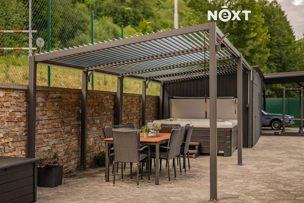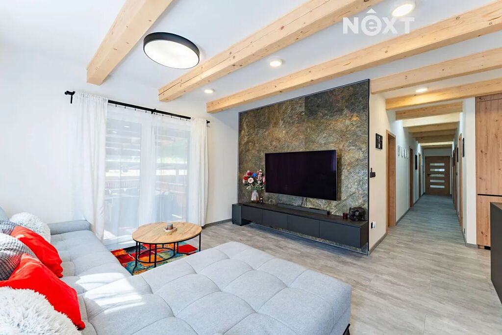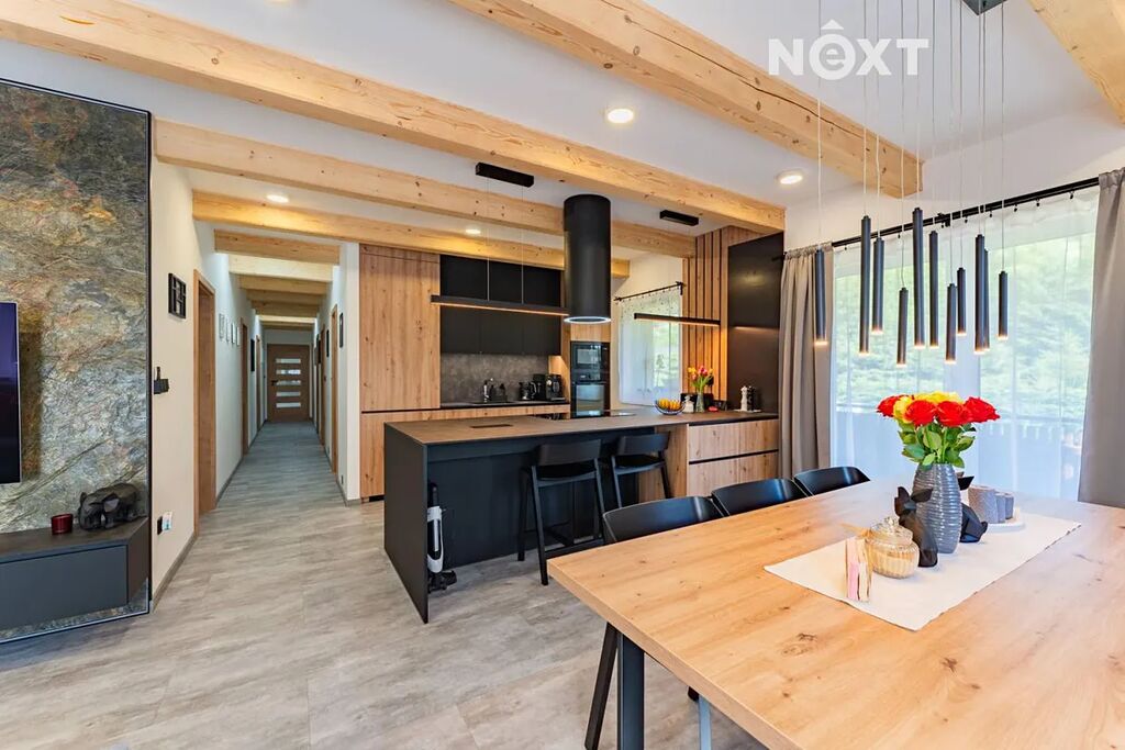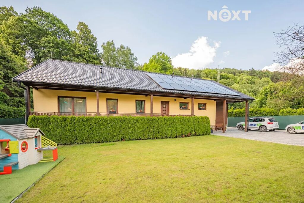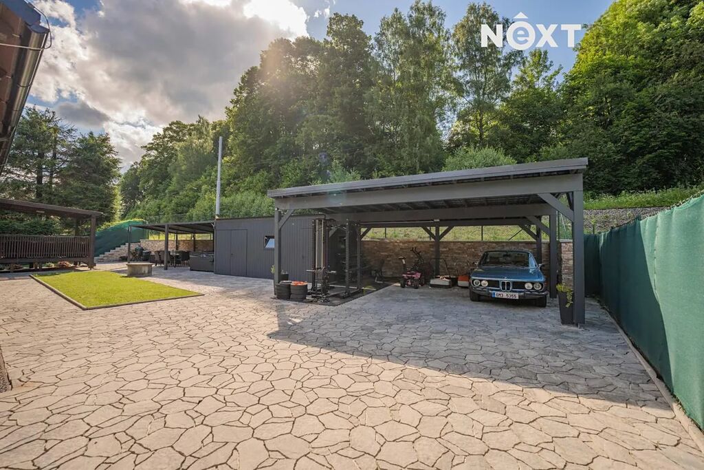 Dům je velice dobře propojen také s exteriérem, z většiny pokojů vedou francouzské dveře na venkovní dřevěný ochoz, z obýváku se dostanete k bazénu v zahradě. Pozemek je oplocen, opatřen elektrickou pojezdovou bránou, z přední strany je zatravněn a vybaven dětským hřištěm s vlastním osvětlením, v zadní části pak převažuje dlažba. Právě zde, v soukromí a na čerstvém horském vzduchu, se nachází letní kuchyň s venkovní toaletou, bioklimatická pergola, přístřešek na auta a zahradní domek s vlastním rozvaděčem pro venkovní a relaxační prostor.