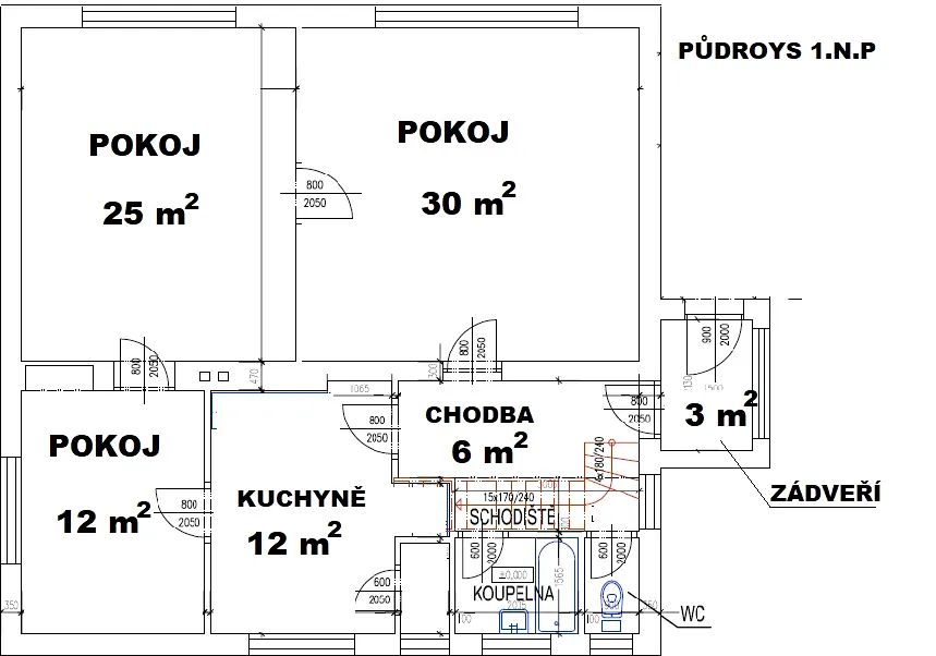 1. nadzemní podlaží: vstupní chodba, prostorný obývací pokoj, kuchyně, ložnice, pokoj, koupelna a samostatná toaleta u schodiště.