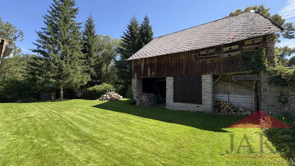 Vedlejší stavby: stodola (zpracovaná studie na moderní objekt Šumavského rázu), dřevník.