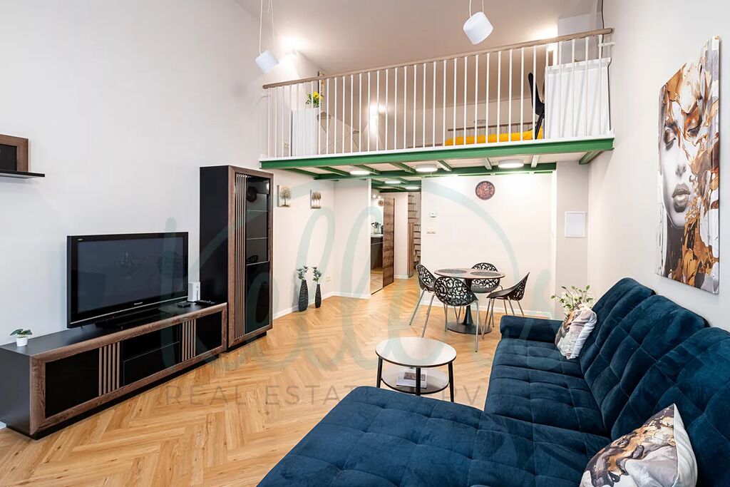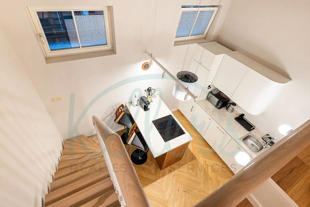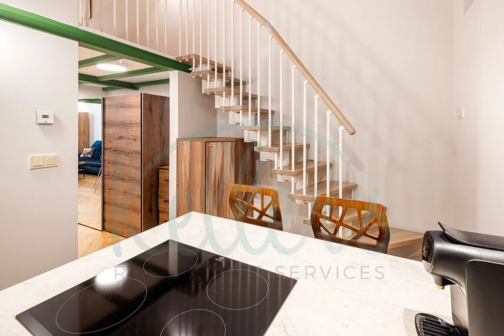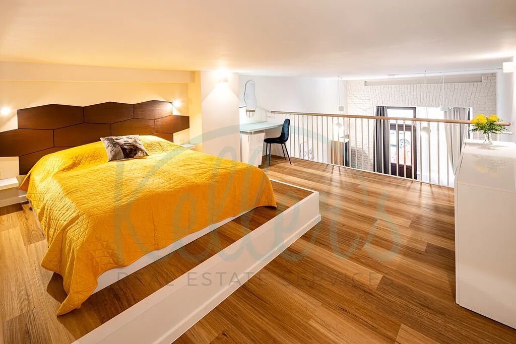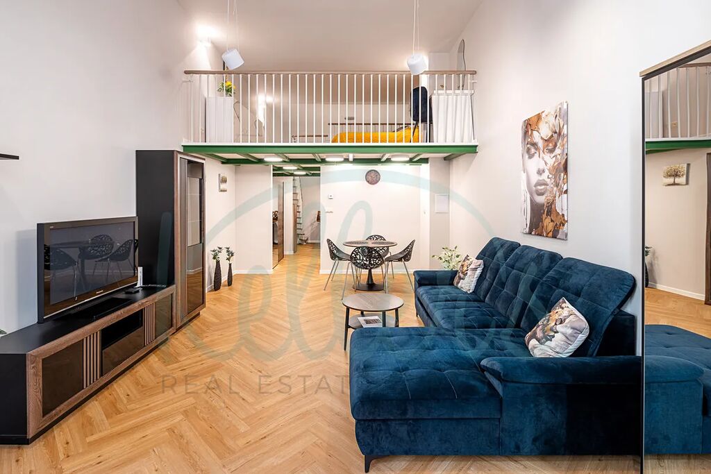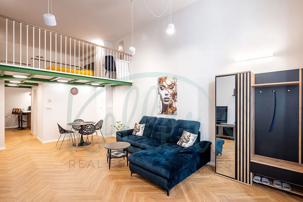 Prostor je v současnosti zařízen a vybaven jako byt – s vysokým stropem, otevřeným patrem využívaným jako ložnice a kompletním vybavením včetně nábytku, spotřebičů a doplňků. Díky tomu je připraven k okamžitému užívání bez dalších investic.