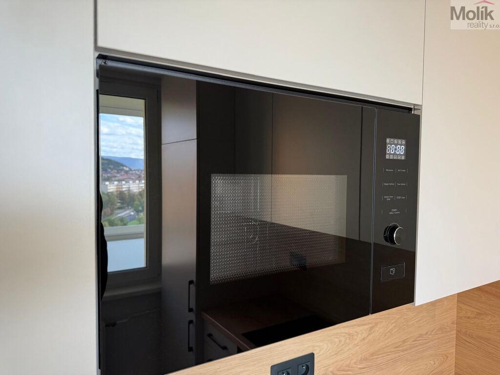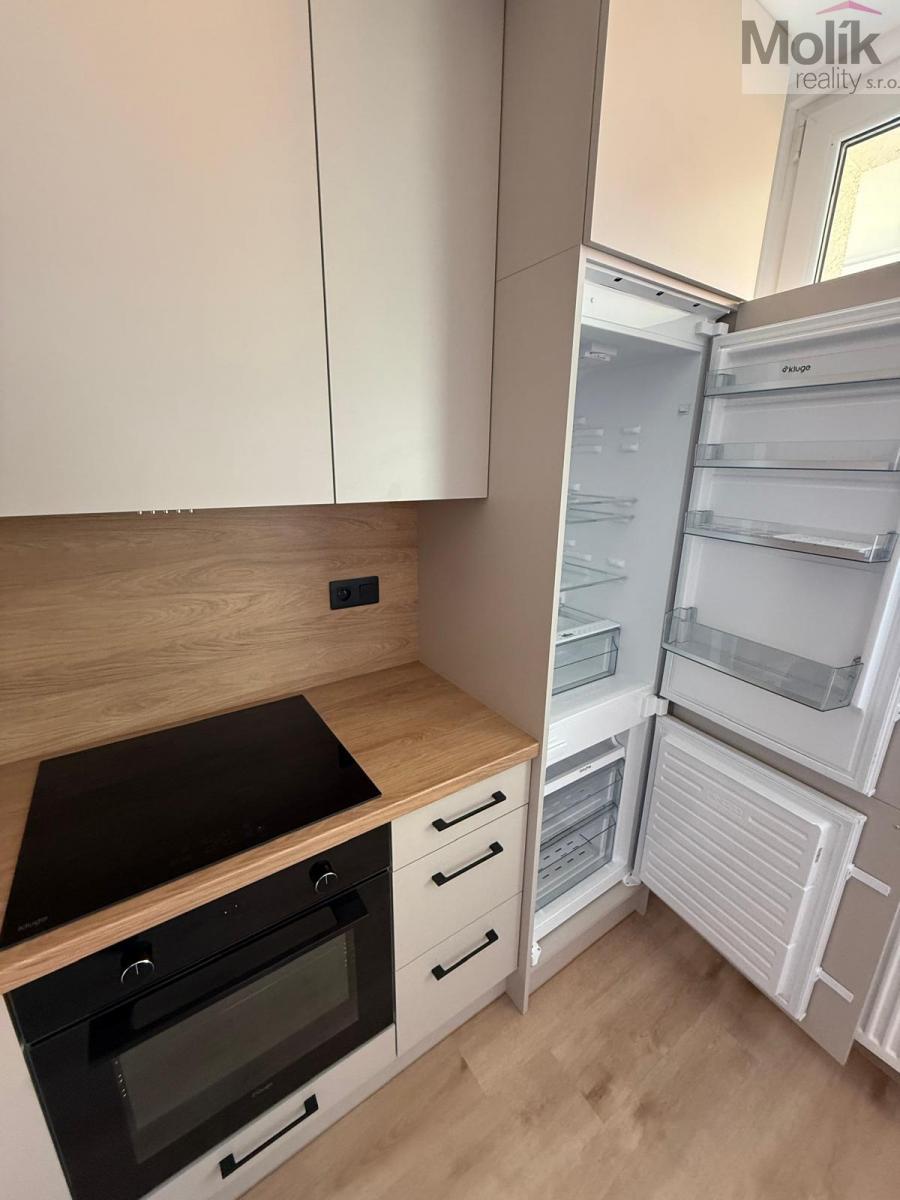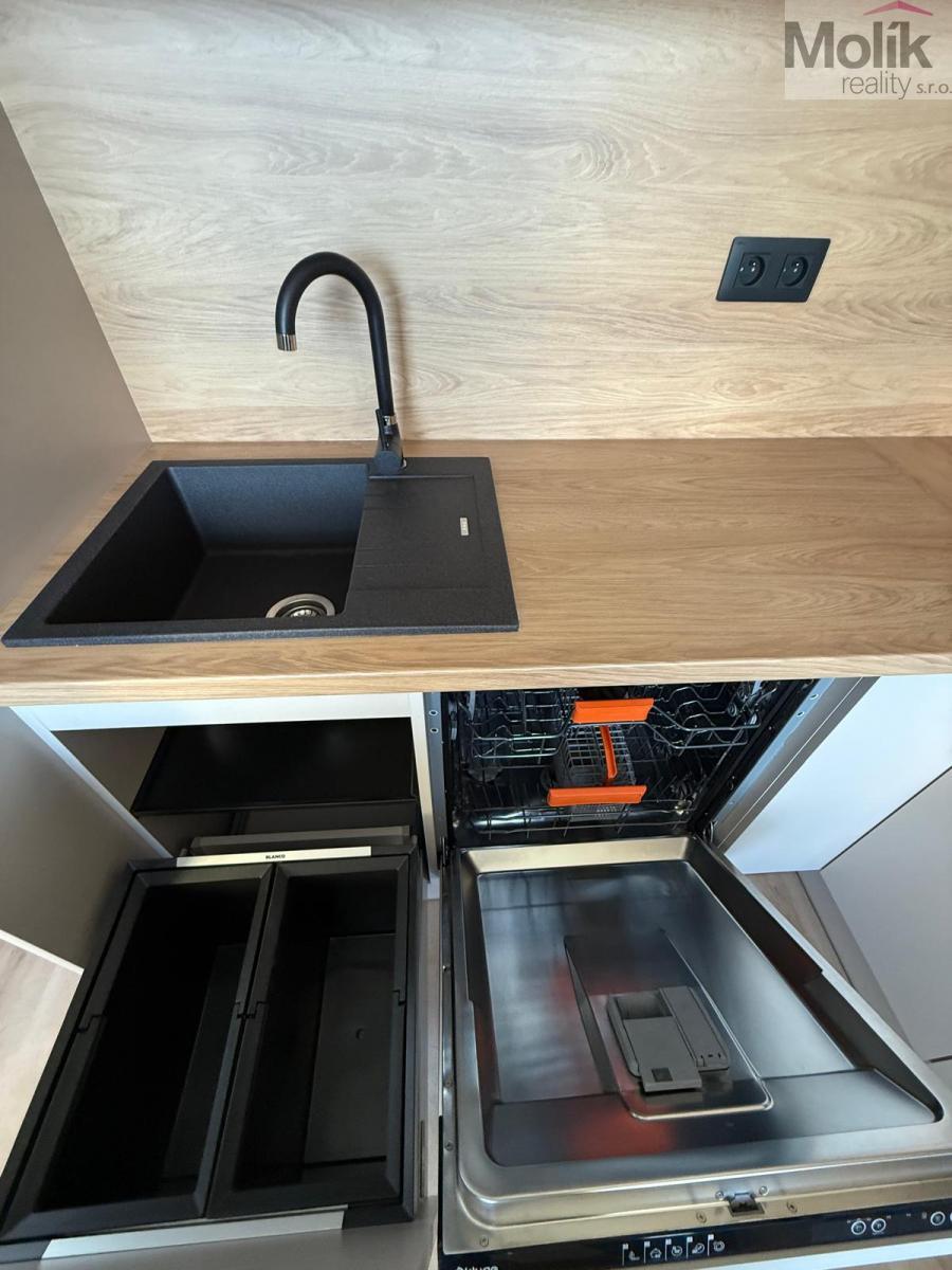 V bytě je moderní kuchyňská linka na míru od truhláře s vestavěnými spotřebiči.