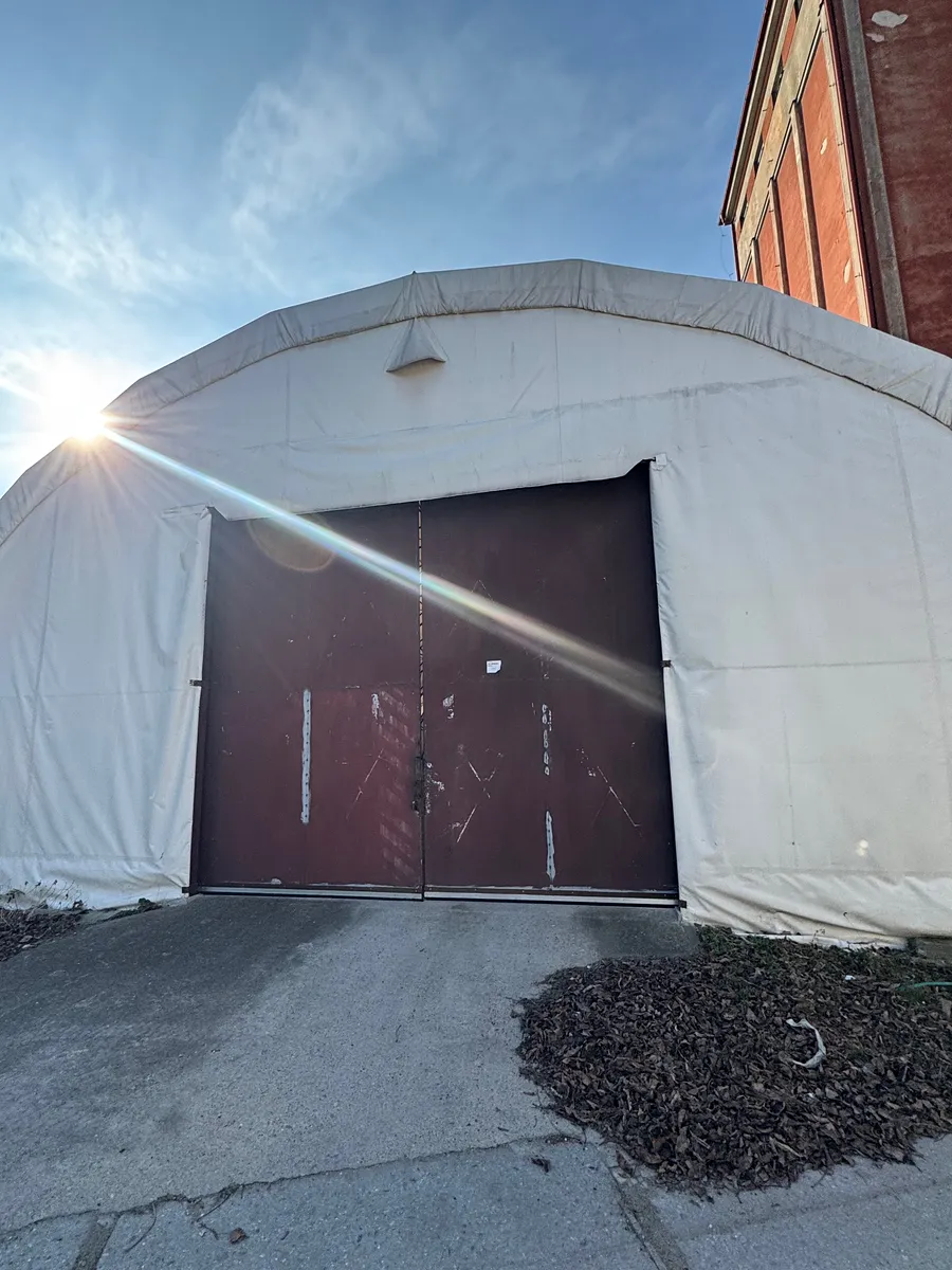 Vstup do haly: Plechová vrata o šířce 3,9 m a výšce 3,52 m