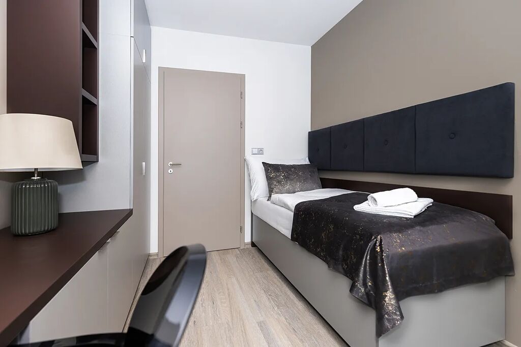 Nabízíme k pronájmu moderně zařízený byt 2+1, o celkové výměře 41 m², v 5. nadzemním podlaží novostavby s výtahem v Hradci Králové. Byt nabízí dva samostatné jednolůžkové pokoje vybavené LCD televizí „55“, lampou, psacím stolem a skříněmi. Oba pokoje mají vlastní vstup na společný balkón, kde je k dispozici venkovní posezení a klidný výhled do vnitrobloku. Společná kuchyň je vybavena kuchyňskou linkou s vestavěnými spotřebiči (lednice s mrazákem, varná deska, mikrovlnná trouba) a jídelním stolem. Kuchyň je plně vybavena nádobím k drobnému vaření, jídelní soupravou atd.. Ze vstupní chodby je průchod do koupelny se sprchovým koutem, žebříkovým radiátorem, WC, velkým zrcadlem a vestavěným fénem. Dále je tu možnost zapojení pračky.