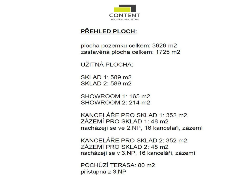 - 2 samostatné skladové jednotky 589 + 589 m², celkem 1178 m²