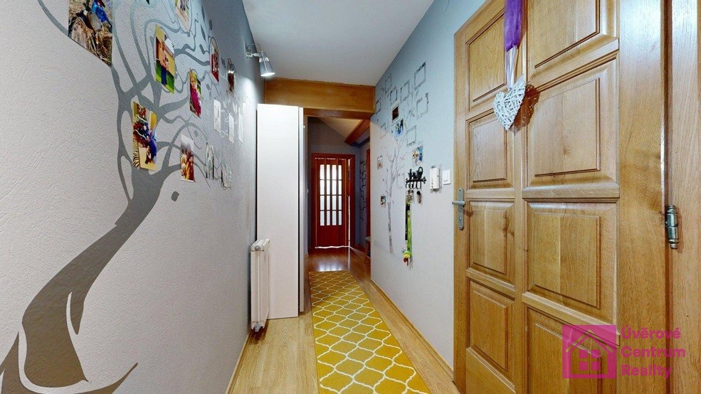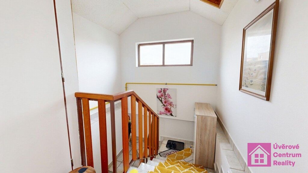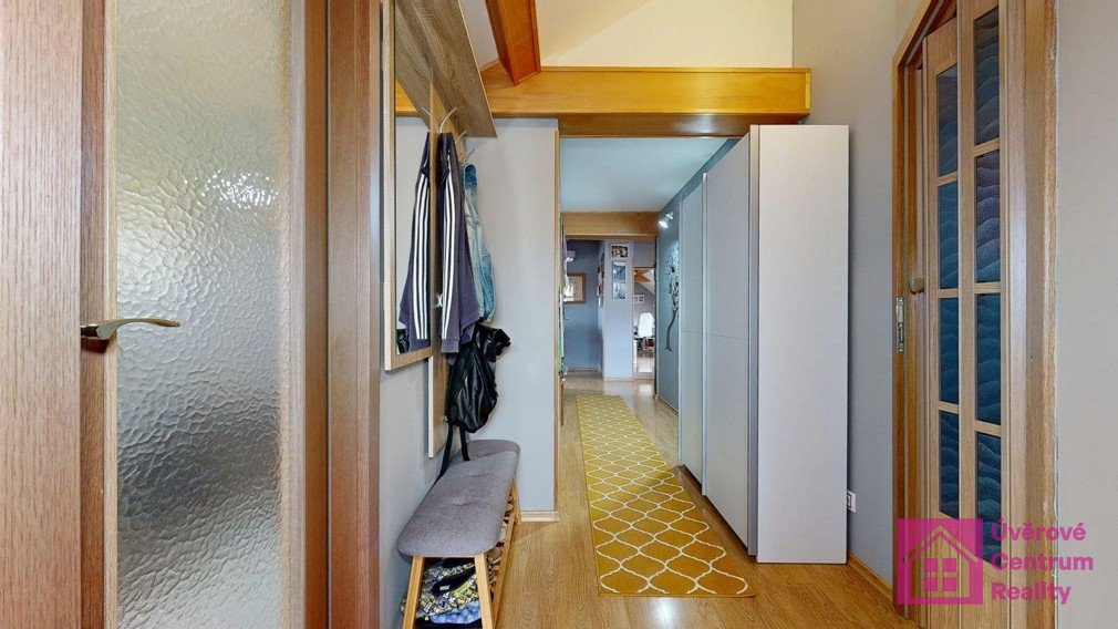 Dispozice: schodiště, chodba se šatnou, kuchyně, ložnice, obývací pokoj, koupelna (vana i sprchový kout), toaleta a dva pokoje. Půdorys bytu naleznete ve fotogalerii.