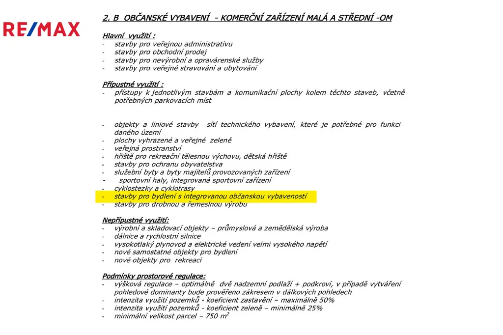 Dle územního plánu je pozemek zařazen do plochy „komerční zařízení malá a střední“, což umožňuje výstavbu provozovny s bydlením majitele, nebo stavby pro bydlení s integrovanou občanskou vybaveností. Využití je tak vhodné jak pro podnikání, tak pro kombinaci s rodinným bydlením.