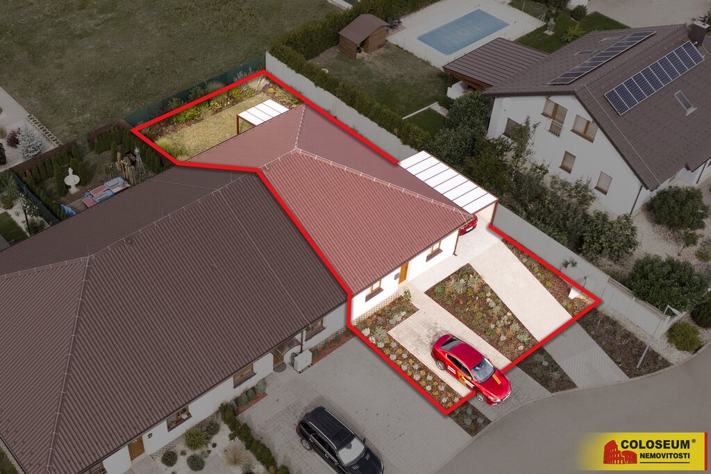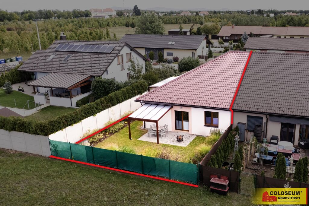 Byt disponuje třemi neprůchozími pokoji, prostornou koupelnou s vanou v teplých přírodních tónech (společnou s toaletou) a velkorysým obývacím pokojem s kuchyní, ze kterého je přímý vstup na terasu krytou pergolou a dále na zatravněnou zahrádku s okrasnou výsadbou. Vlastní pozemek má výměru 257m2.
