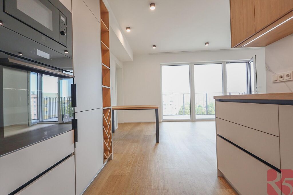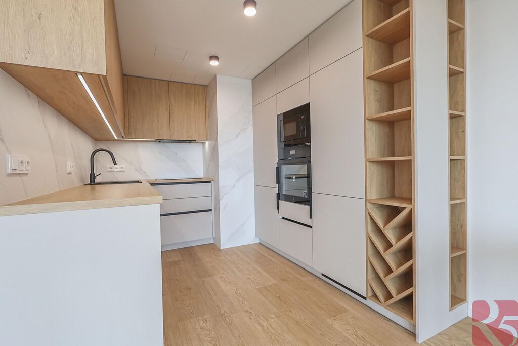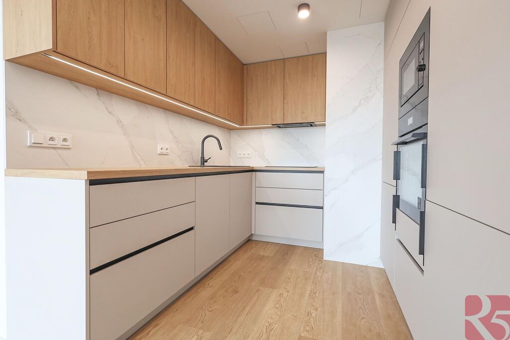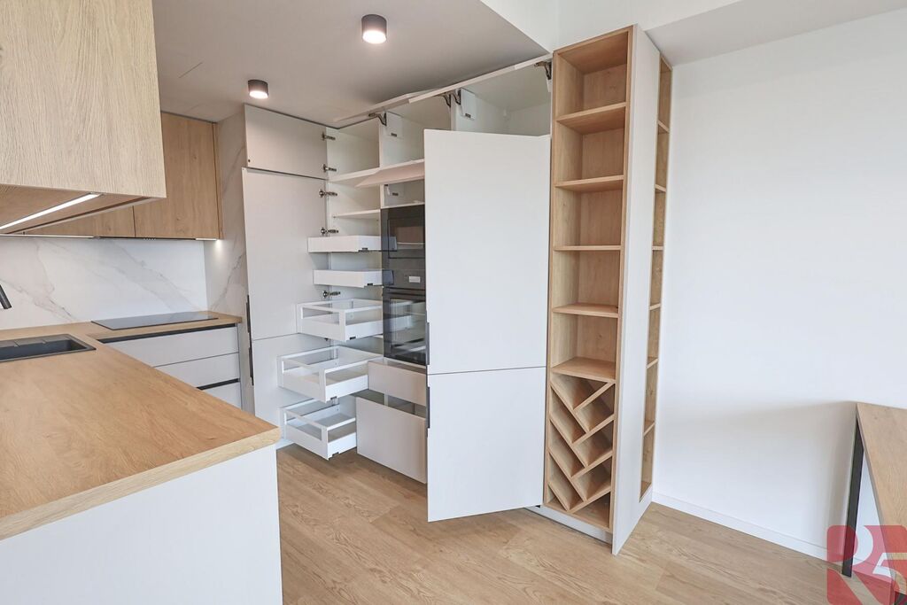 Byt je vybaven moderní prostornou kuchyňskou linkou s vestavěnými spotřebiči, včetně elektrické trouby, varné desky, myčky, lednice s mrazákem a odsavače par, což zaručuje maximální pohodlí při vaření. Integrované LED osvětlení dodává prostoru příjemnou atmosféru.