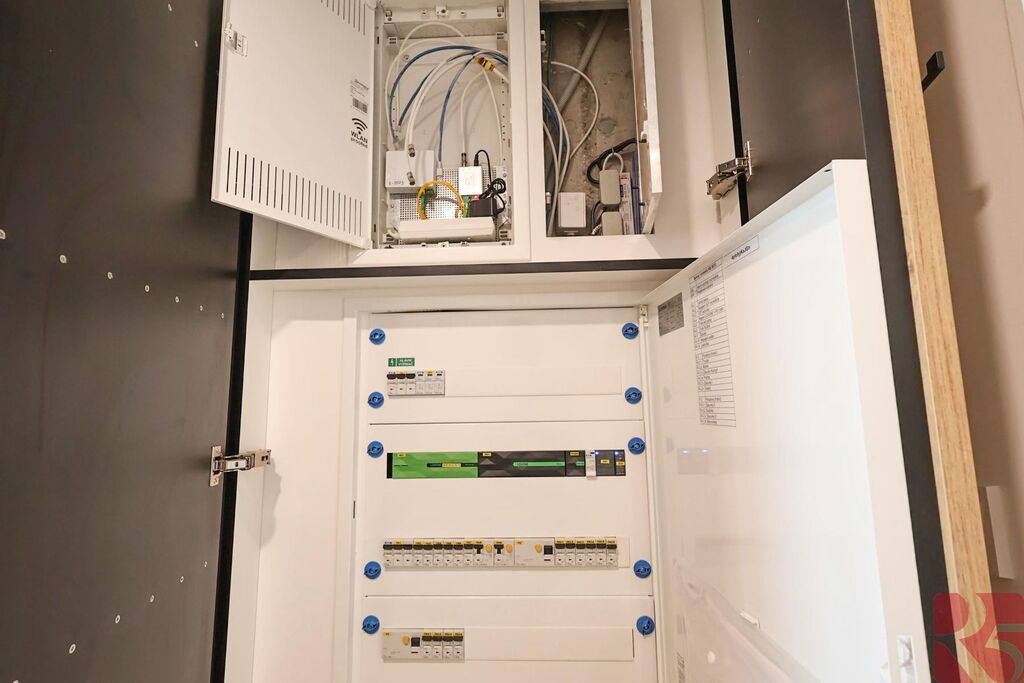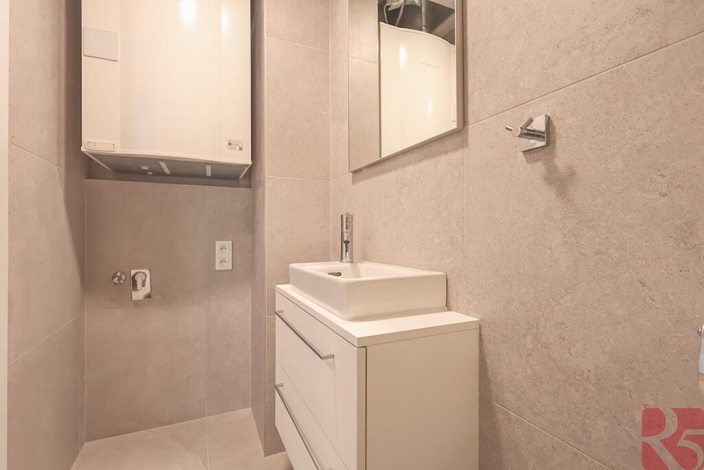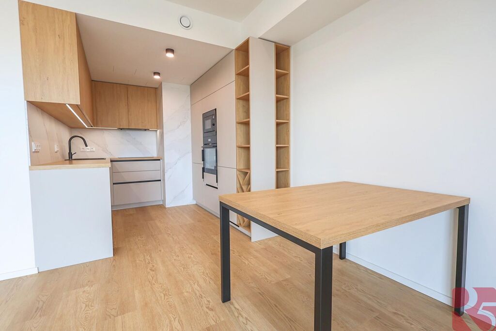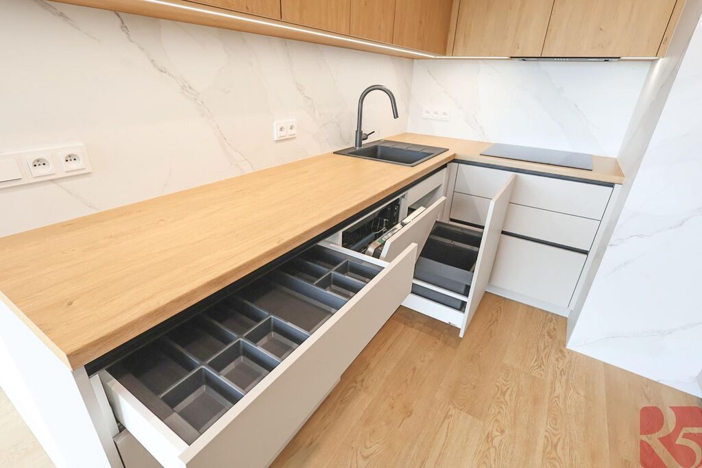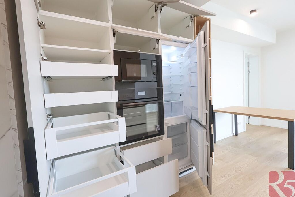 Byt je vybaven moderní prostornou kuchyňskou linkou s vestavěnými spotřebiči, včetně elektrické trouby, varné desky, myčky, lednice s mrazákem a odsavače par, což zaručuje maximální pohodlí při vaření. Integrované LED osvětlení dodává prostoru příjemnou atmosféru.