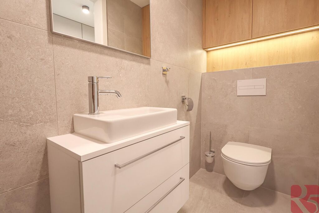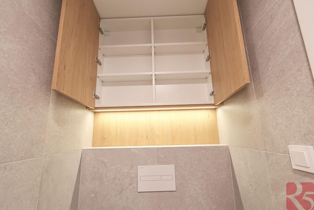 Ve vstupní chodbě se nachází vestavěná šatní skříň, která poskytuje dostatek úložného prostoru pro vaše věci. Samostatná toaleta je vybavena připojením na pračku, rekuperační jednotkou a vestavěným nábytkem pro uložení drobných věcí, což zvyšuje funkčnost a pohodlí.