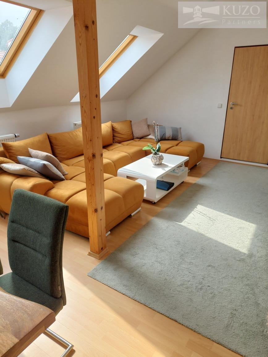 Pronájem kompletně zařízeného bytu 3+1, 85m2 . V podkrovním bytě se nachází kuch.linka s elektrospotřebiči, (sporák s troubou, digestoř, lednice), jídelní část, stůl, židle, ostatní nábytek v pokojích, viz. foto, je součástí zařízení bytu. Byt má samostatný vchod.