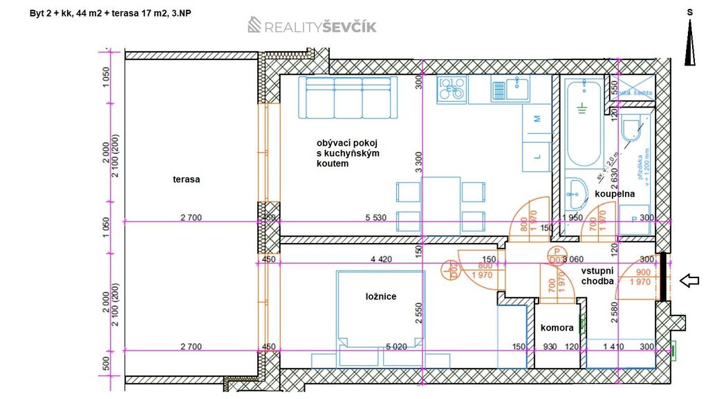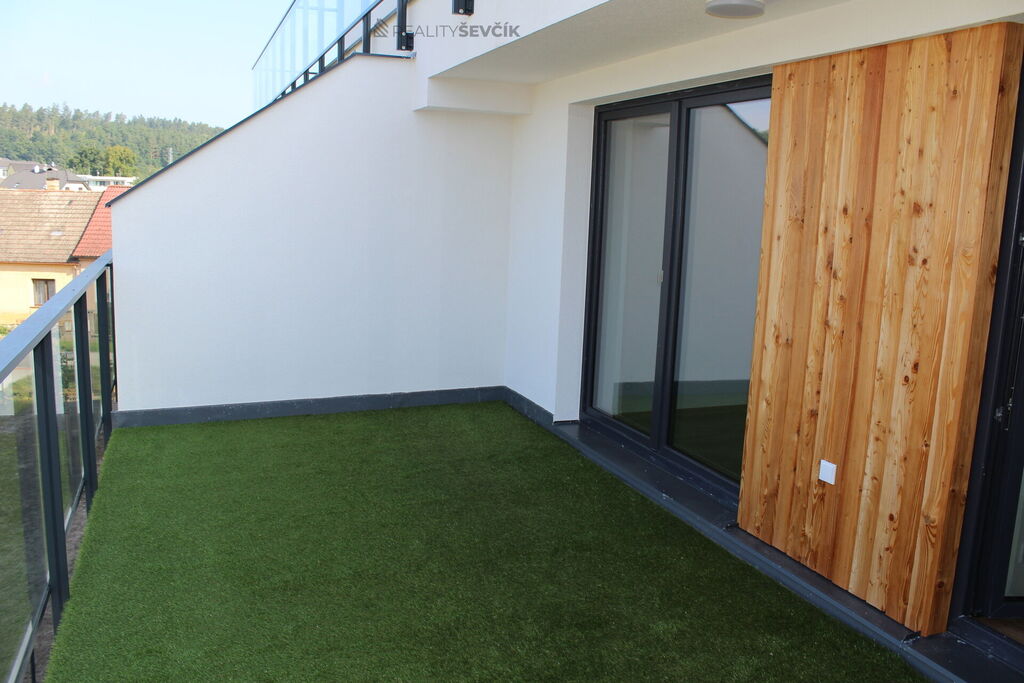Nabízíme k pronájmu krásný slunný byt 2+kk o výměře 44 m2 s terasou 17 m2 v novostavbě bytového domu v ul. Potoční v Hluboké nad Vltavou. Byt je umístěn v 3.NP nového bytového domu (s výtahem) v Hluboké nad Vltavou v blízkosti OD Billa. Byt se stává ze vstupní chodby, samostatné komory, koupelny s vanou a WC, dále pak z obývacího pokoje s kuchyňským koutem a samostatné ložnice. Z obývacího pokoje a z ložnice je vstup na krásnou terasu, která je situována na západ . Součástí bytu je kompletní osvětlení všech pokojů, dále pak vybavená kuchyňská linka včetně elektrospotřebičů (sklokeramická deska, trouba, digestoř a myčka). Na podlahách jsou dlažby a vinyl v dekoru dřeva. Vytápění a ohřev vody je zajištěn centrálním kotlem na plyn a v každém bytě je rekuperační jednotka. K bytu náleží sklepní kóje o výměře 2,5 m2 a parkovací stání pro jeden vůz přímo před domem.