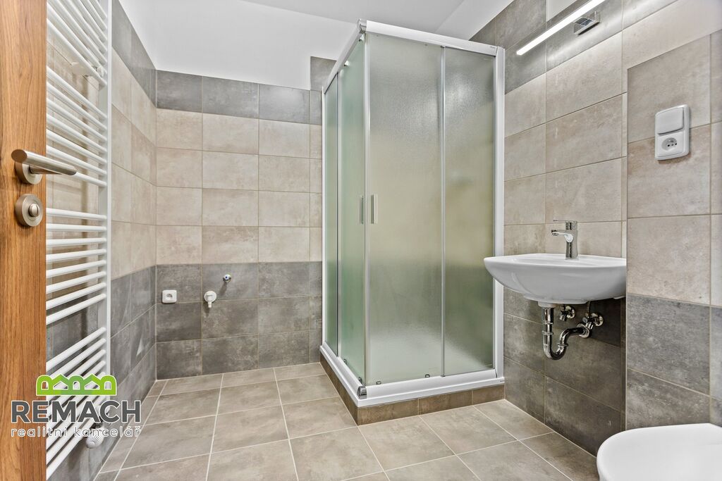 Koupelna se sprchovým koutem a přípojkou na pračku.