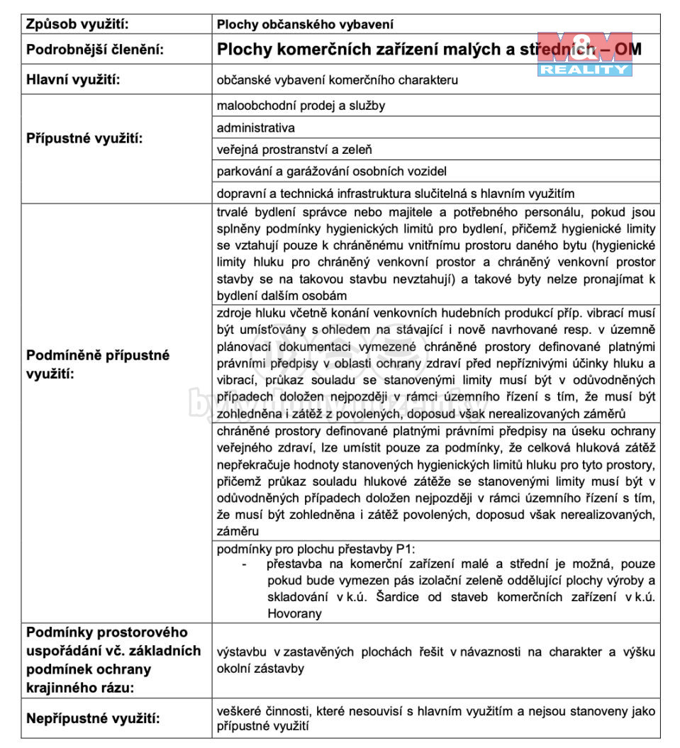 Nabízíme pozemek určený pro komerční občanské vybavení menšího a středního rozsahu. Vhodný je pro maloobchod, služby či administrativu. Přípustné je také parkování, veřejná zeleň, dopravní a technická infrastruktura. Možné je i bydlení správce či majitele, pokud jsou splněny hygienické limity. Hlučné provozy a hudební produkce musí respektovat chráněné prostory dle platných předpisů. Při přestavbě je nutné vymezit izolační zeleň oddělující komerční a výrobní plochy. Výstavba musí navazovat na okolní zástavbu a krajinný ráz. Nepřípustné je využití nesouvisející s hlavním určením. Výborná příležitost pro podnikání v atraktivní lokalitě. Více informací v RK.