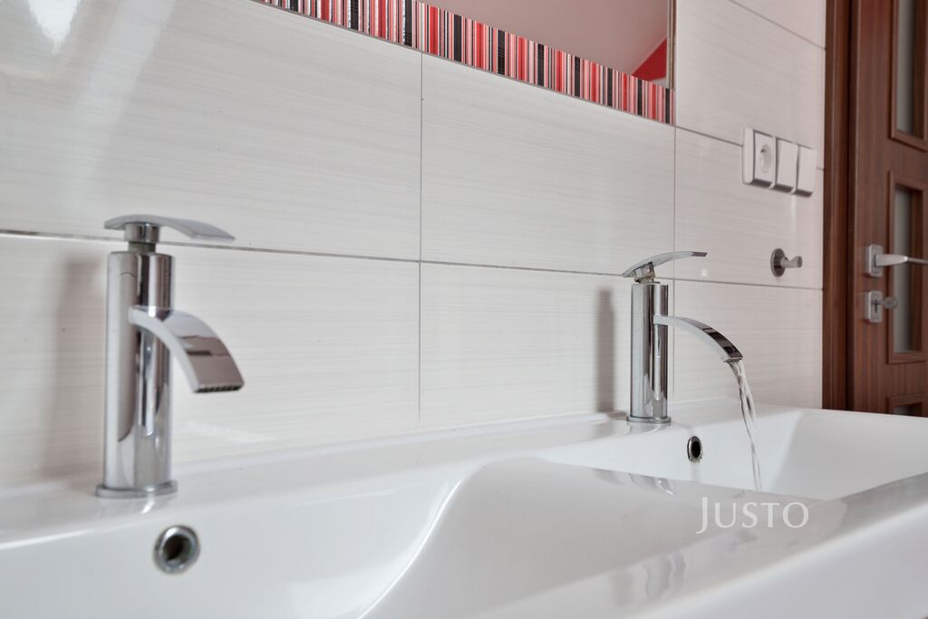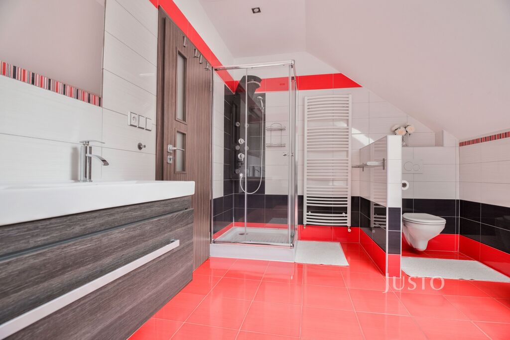 o moderní koupelna s vanou a sprchovým koutem, dvoj umyvadlem a toaletou.