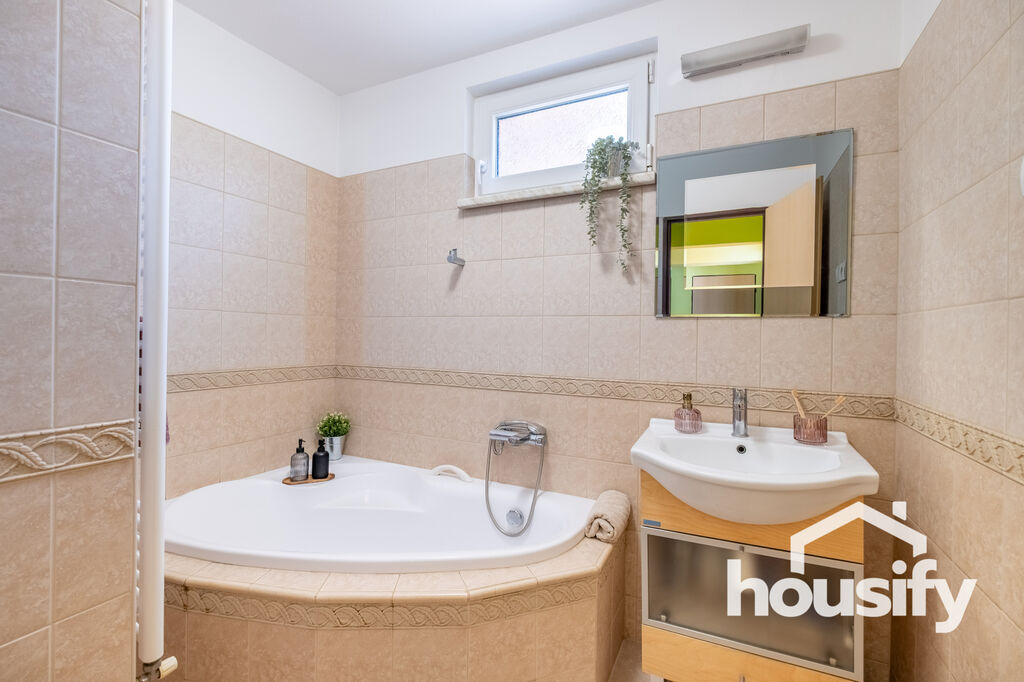 Přízemí domu zahrnuje prostornou halu, dva pokoje, obývací pokoj, samostatnou prostornou kuchyni se vstupem na terasu, koupelnu s rohovou vanou a samostatnou toaletu. Z haly se schodištěm dostanete do prvního patra, kde najdete další dva pokoje, toaletu a vstup do dvou půdních prostor.