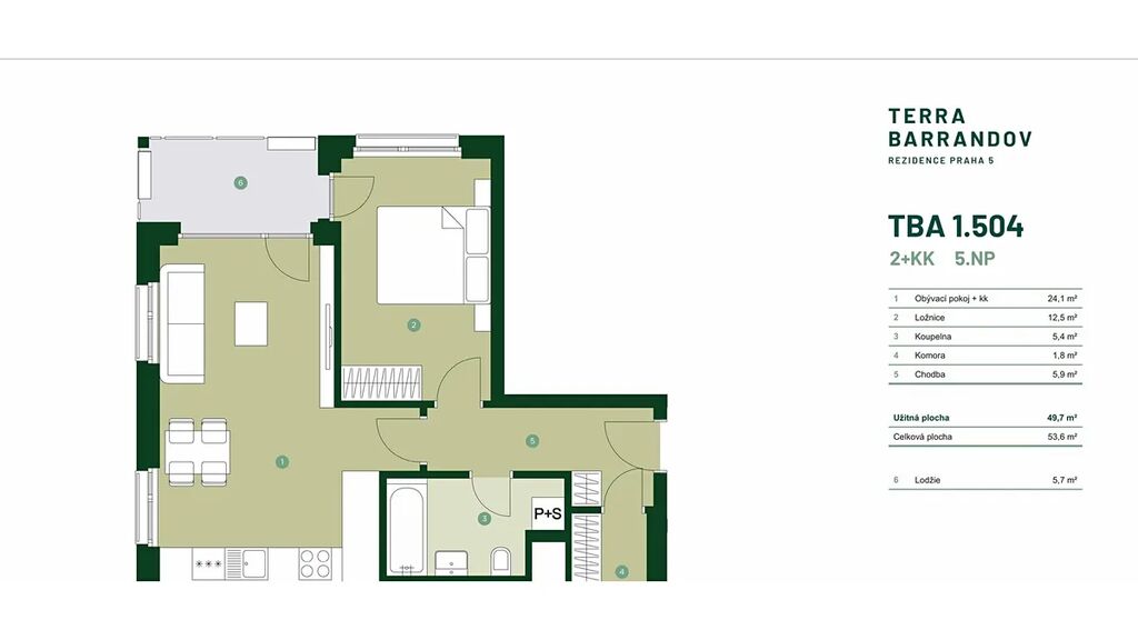 Nabízíme moderní byt 2+kk v 5. nadzemním podlaží prestižního projektu Terra Barrandov. Tento prostorný byt s praktickým uspořádáním a vysokým standardem nabízí ideální prostředí pro komfortní život. Dispozice zahrnuje velký obývací pokoj s kuchyňským koutem a ložnici s přístupem na lodžii. Koupelna je zařízena vanou a toaletou. Je zde praktická komora a předsíň s dostatkem úložných prostor. K bytu náleží sklepní kóje. Možnost dokoupení garážového stání.