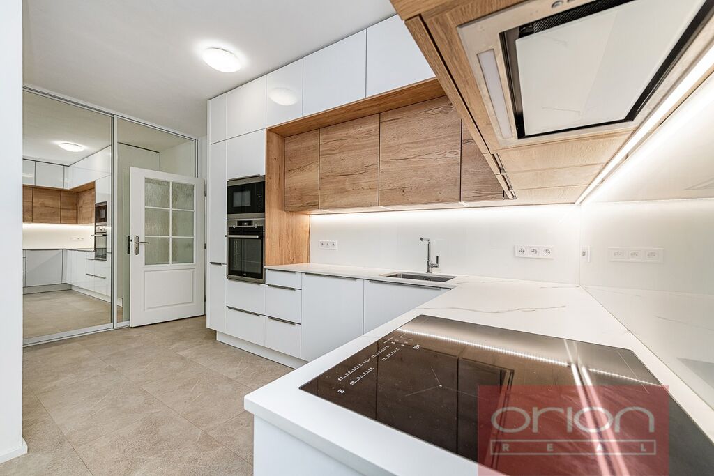 Dispozice bytu nabízí zádveří, prostornou chodbu s vestavěnými skříněmi, samostatnou kuchyň s moderní kuchyňskou linkou s pracovní deskou Dekton a všemi kuchyňskými spotřebiči, 5 samostatných pokojů, 1 koupelnu se sprchovým koutem a toaletou, 1 koupelnu s vanou, 2 samostatné toalety a technickou místnost s vestavěným policovým systémem, pračkou a sušičkou. Ve dvou ložnicích jsou vestavěné skříně a nábytek, podlahy jsou kvalitní vinylové. Vytápění je zajištěno plynovou kotelnou v domě.
