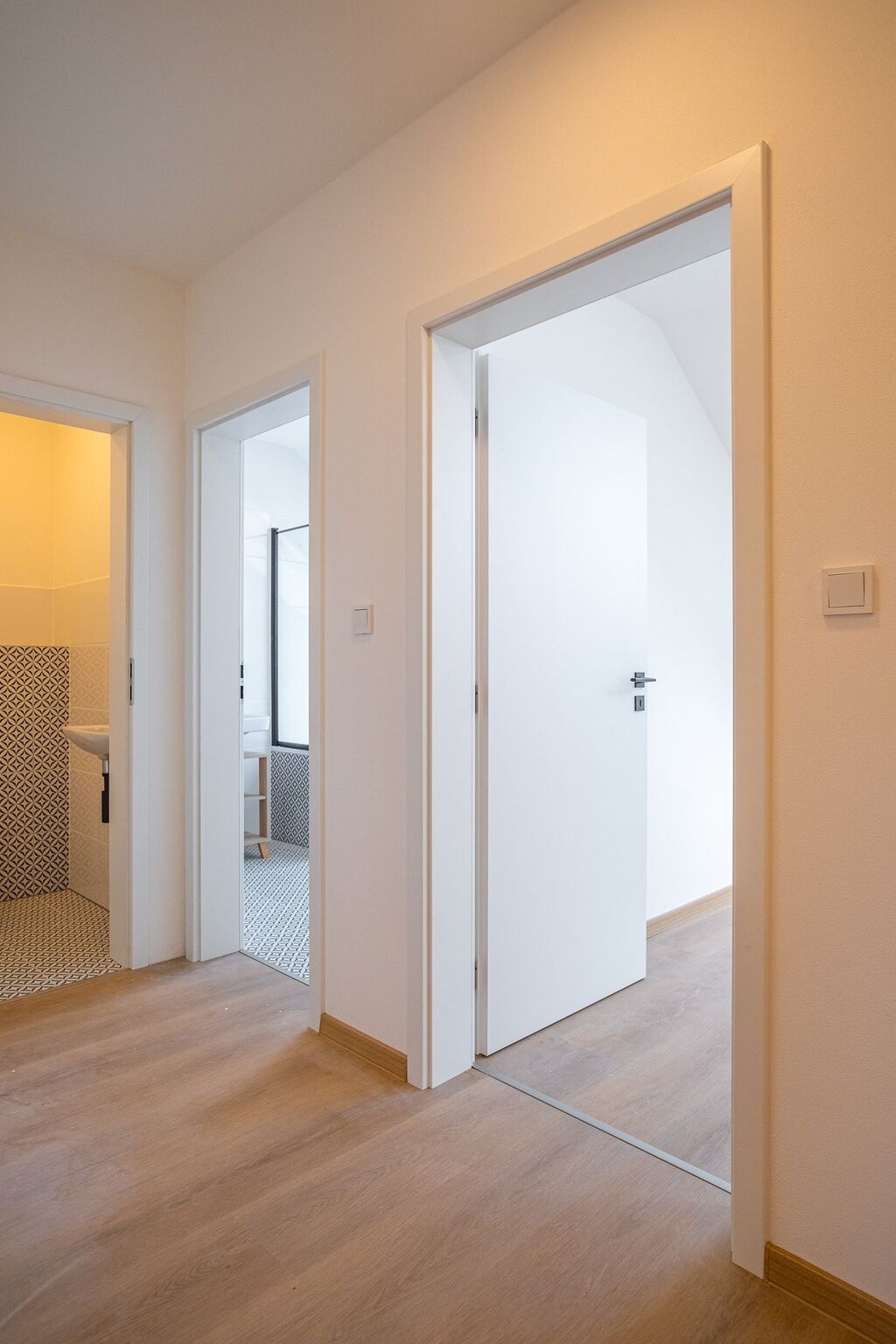 Dispozičně prostor tvoří zádveří, prostorná koupelna s vanou, sprchovou zástěnou, také prostor pro pračku. Samostatné WC. Na zádveří navazuje obývací pokoj s jídelní částí vybavenou novou kuchyňskou linkou a vestavěnými spotřebiči, mezi nimiž nechybí indukční varná deska, elektrická trouba ani mikrovlnná trouba. Z jednoho pokoje můžete udělat šatnu či dětský pokoj. Prostorná ložnice je samostatně přístupná a oddělena od obývací části. Stejně tak má samostatný vstup další místnost, např. dětský pokoj nebo pracovna. Pokoje jsou hezky prosvětlené, díky vhodné orientaci světových stran a ze spojovací chodby jsou všechny pokoje samostatné – tedy neprůchozí, což jistě oceníte.