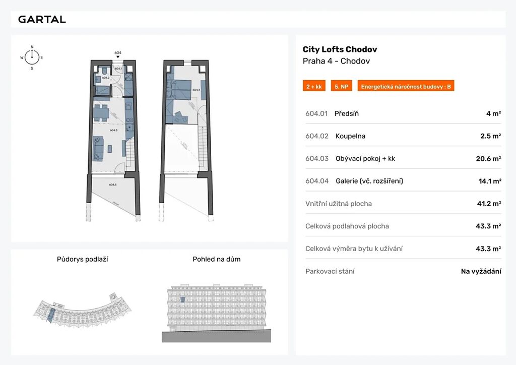 Nabízíme k prodeji loftový byt (604) o dispozici 2+kk (43,3 m2) v projektu City Lofts Chodov, který se skládá z obývacího pokoje (20,6 m2), galerie (14 m2), koupelny s WC (2,5 m2), předsíně (4 m2) a lodžie (8,7 m2).