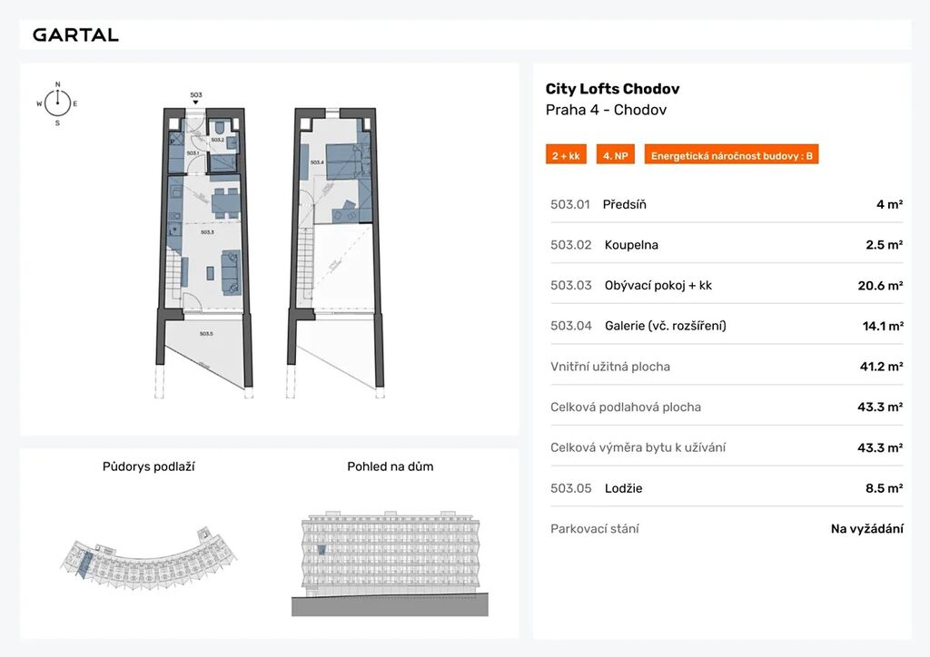 Nabízíme k prodeji loftový byt (503) o dispozici 2+kk (43,3 m2) v projektu City Lofts Chodov, který se skládá z obývacího pokoje (20,6 m2), galerie (14 m2), koupelny s WC (2,5 m2), předsíně (4 m2) a lodžie (8,7 m2).