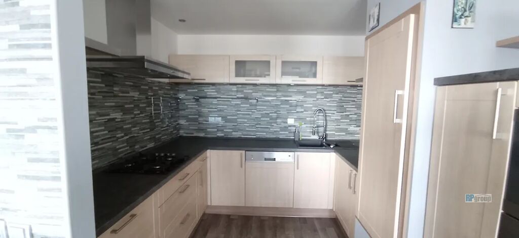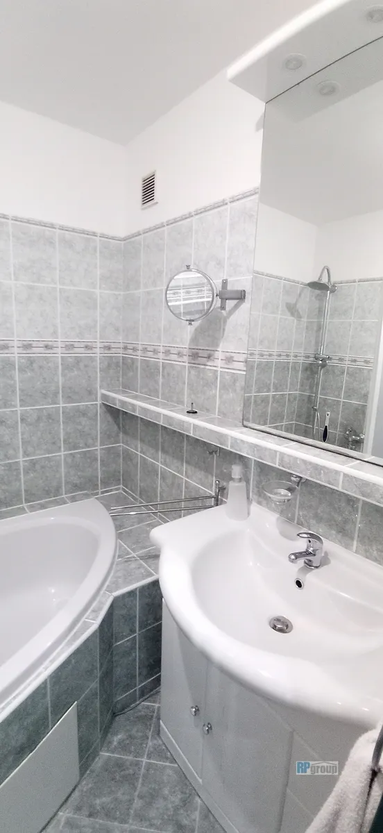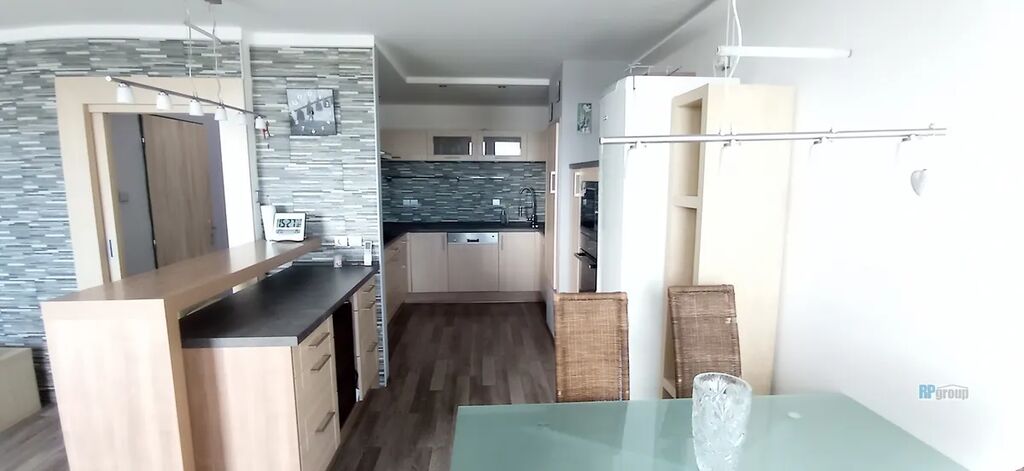 Po vstupu do bytu se nacházíte v chodbě, z které je vstup postupně do každé místnosti zvlášť. Na konci chodby je krásný obývací prostor s kuchyní, která je plně zařízena od nádobí počínaje, až po velmi kvalitní spotřebiče – trouba, mikrovlnka, myčka, plynový sporák, digestoř, vinotéka, lednice s mrazákem. V bytě je také pračka a sušička.