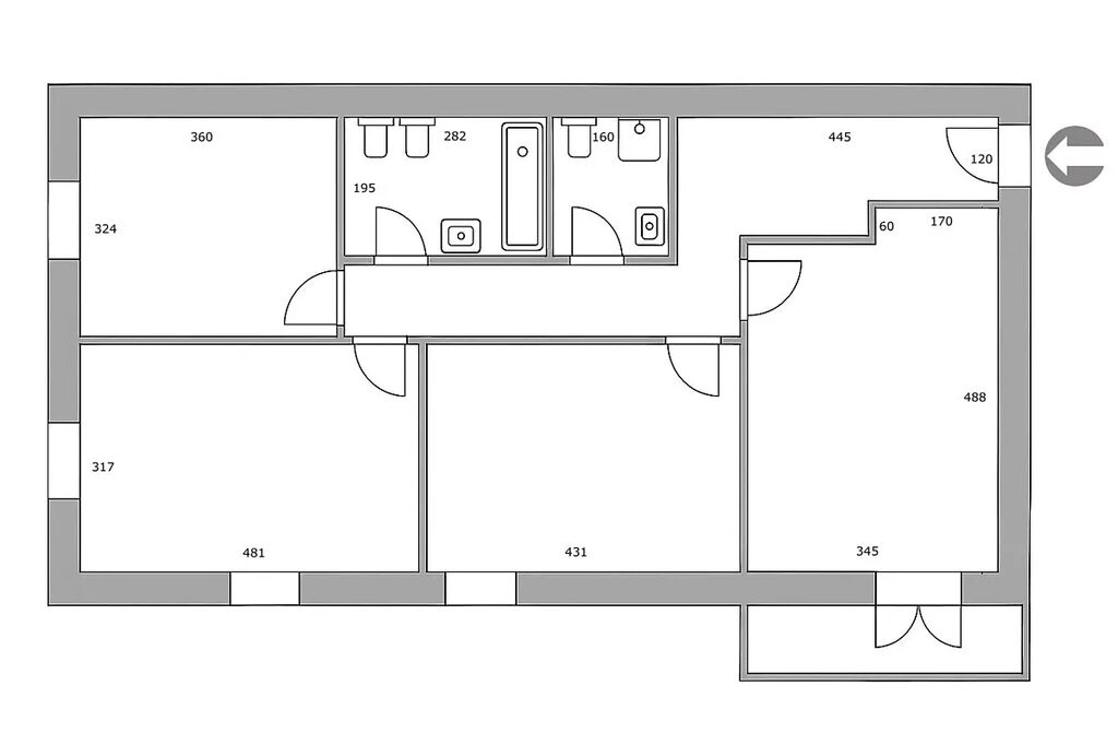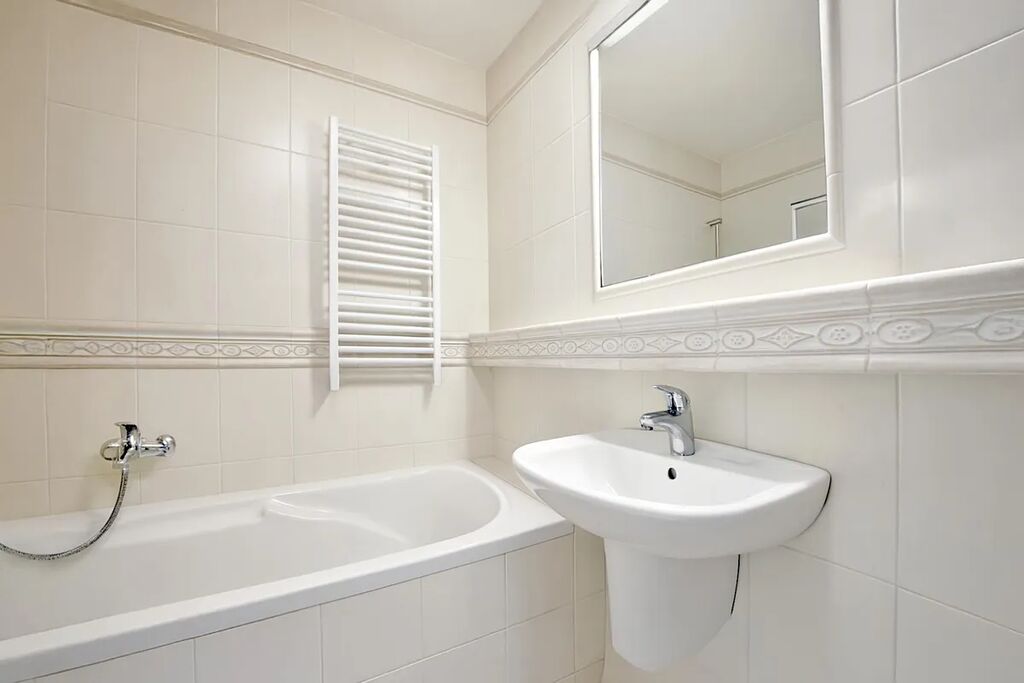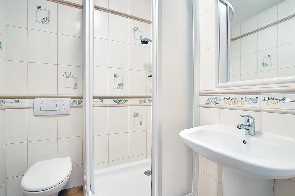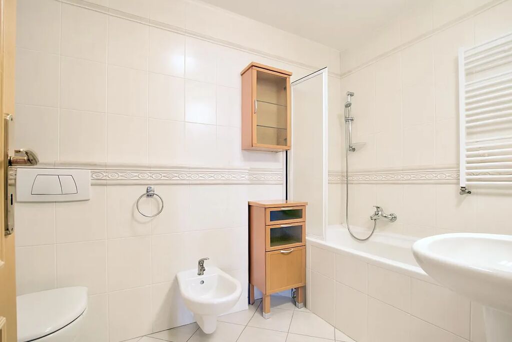- 2 koupelny (jedna s vanou, WC, bidetem a koupelnovou skříňkou; druhá se sprchovým koutem a WC),