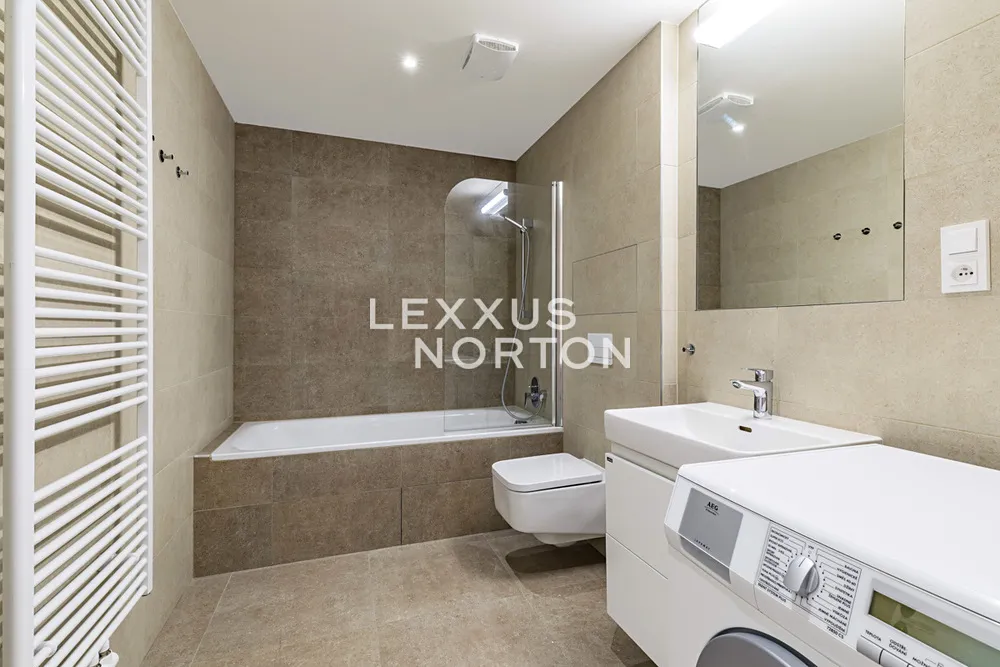 Byt disponuje vstupní chodbou, prostorným obývacím pokojem s plně vybaveným kuchyňským koutem (lednice, mrazák, mikrovlnná trouba, indukce, trouba, myčka nádobí) s jídelní částí a přímým vstupem na balkón a lodžii, 2 ložnice, přičemž jedna z nich má svou vlastní šatnu a přímý vstup na balkón. Dále disponuje pracovnou, koupelnou (vana a toaleta) a samostatnou toaletou. K bytu náleží sklep a garážové stání v ceně nájmu. Možnost pronájmu dalšího garážového stání za příplatek 2.000 Kč.